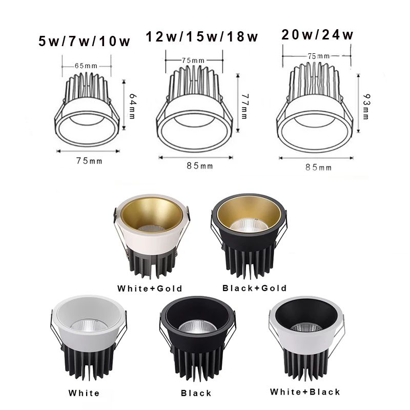 Приглушаемая Светодиодная лампа, встроенная потолочная лампа, точечный светильник, алюминиевый светодиодный COB светильник, 7W10W12W15W18W20W24W, 220 В переменного тока, для дома и офиса
