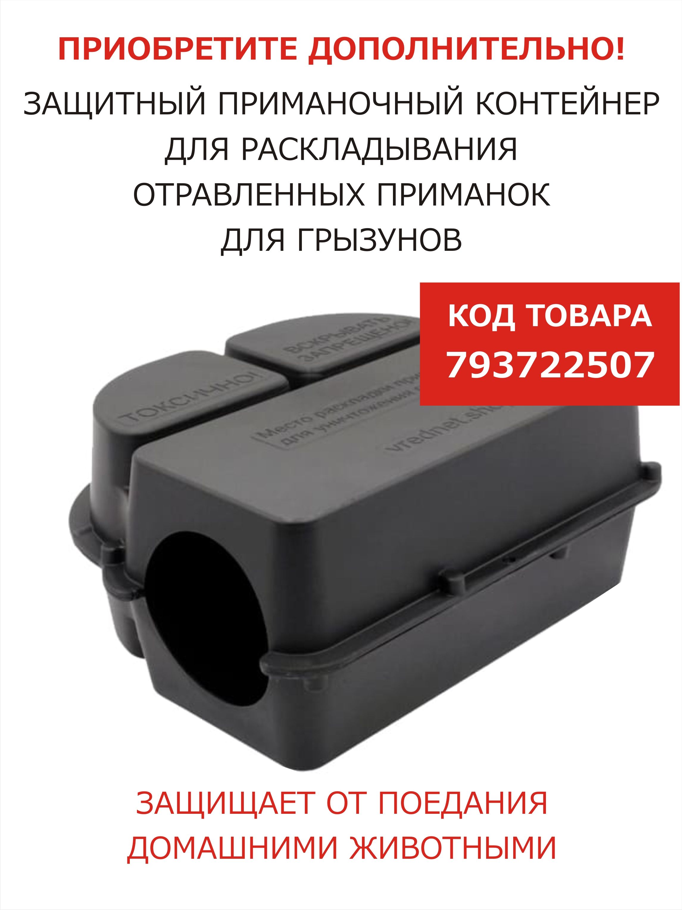 Приобретите также защитный приманочный контейнер К ЛУК - ёмкость для  раскладывания  отравленных приманок в виде брикетов, гранул, зерна для уничтожения грызунов. Он препятствует случайному поеданию домашними животными или маленькими детьми, разносу отравы по территории, защищает приманку от атмосферных осадков. Код на ОЗОН 793722507