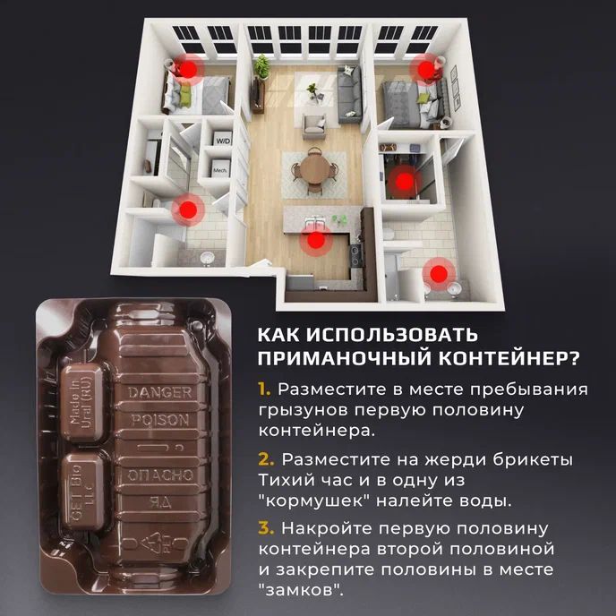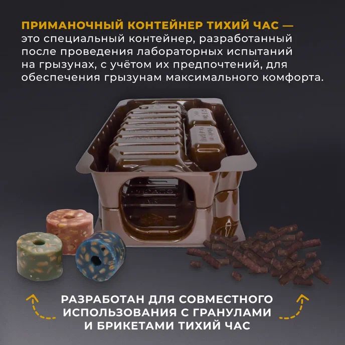 Приманочный контейнер Тихий Час — это специальный контейнер, разработанный после проведения лабораторных испытаниях на грызунах, с учётом их предпочтений, для обеспечения грызунам максимального комфорта. Разработан для совместного использования с брикетами и гранулами Тихий час.