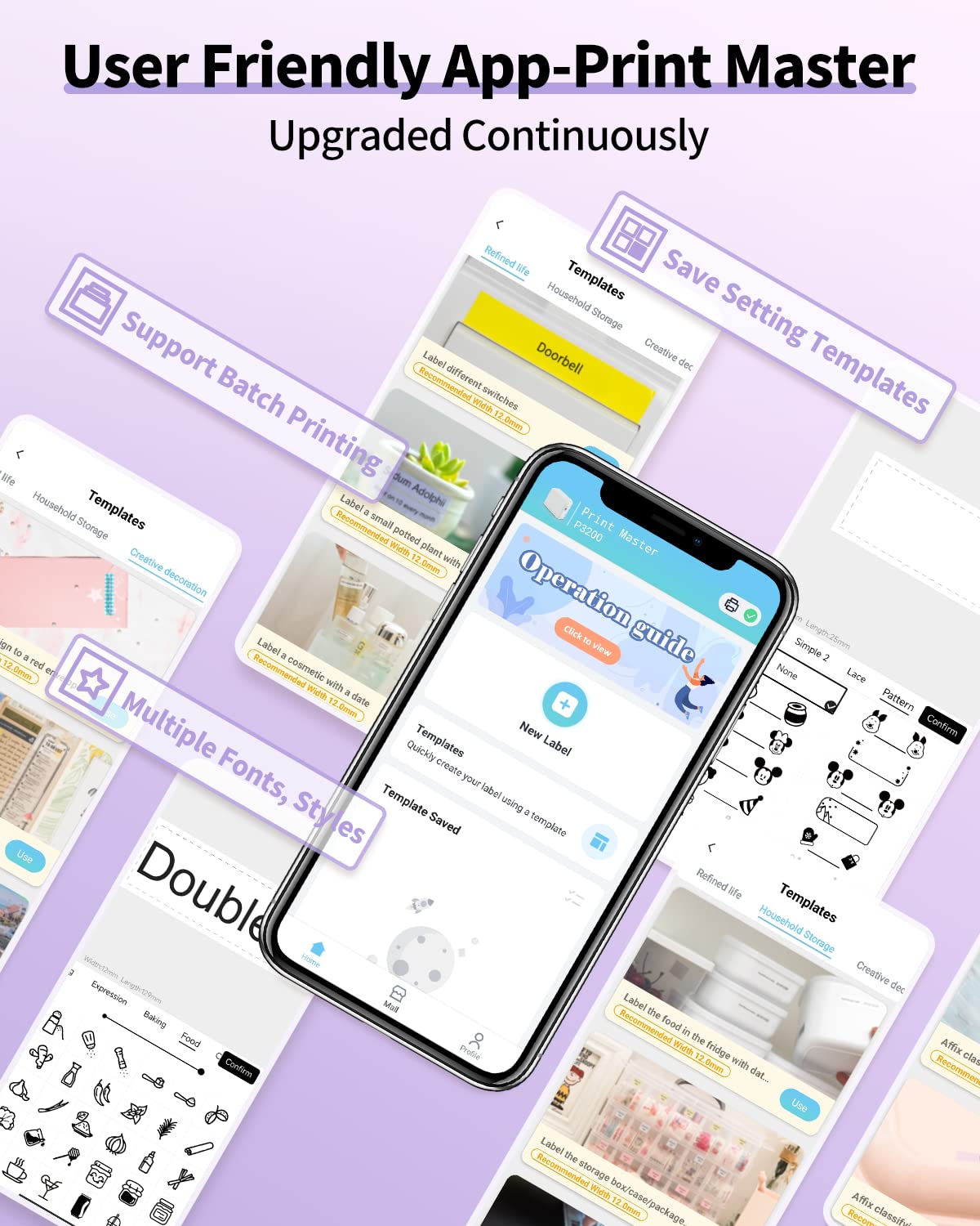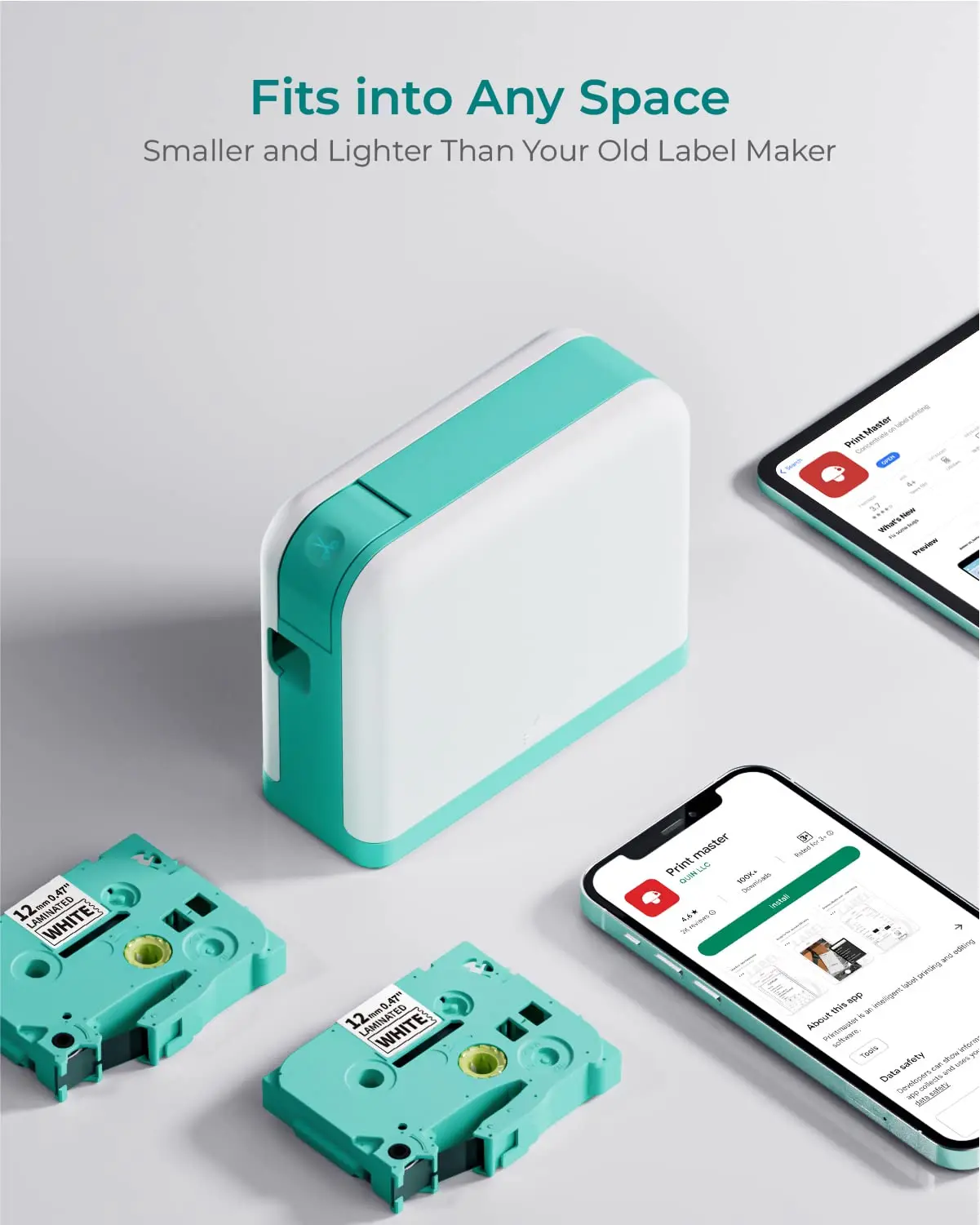 Прочная ламинированная лента: водостойкая, выцветающая, химическая, устойчивая к истиранию и температуре, непрерывная печать с автоматическим центрированием печатного содержимого, портативный и настольный компьютер, соединение Bluetooth, перезаряжаемый, зарядка типа C, термальное печатание передачи