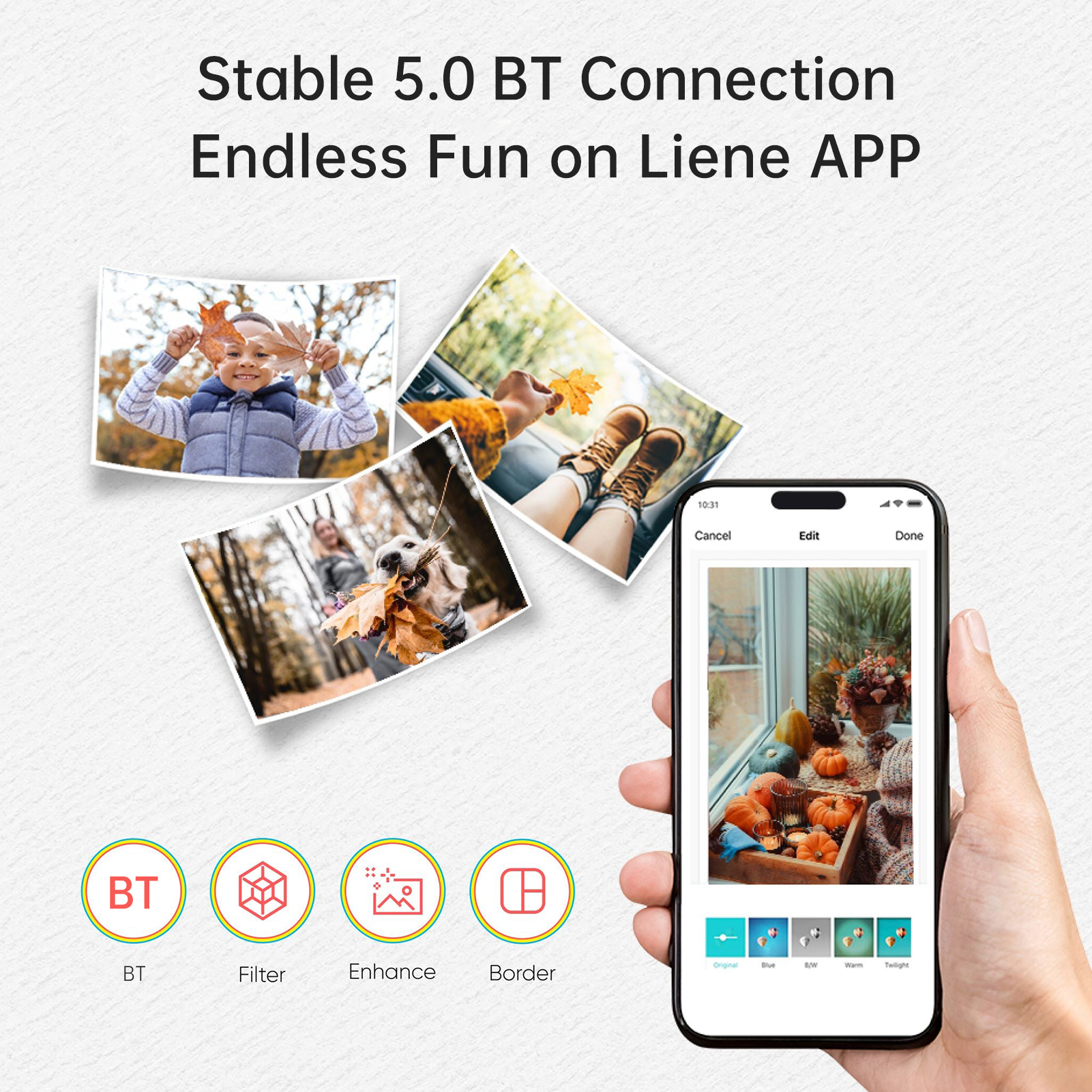 [Liene App делает фотографии лучше] Многофункциональное приложение, которое поможет вам изменять и редактировать ваши фотографии. Загрузите приложение Liene Photo для печати. С 8 фильтрами, вы можете свободно изменять атмосферу ваших фотографий, а с 4 различными функциями персонализировать макет ваших фотографий. Будь то подарок на день рождения или подарок на выпускной для ваших друзей, мини-принтер-хороший выбор.