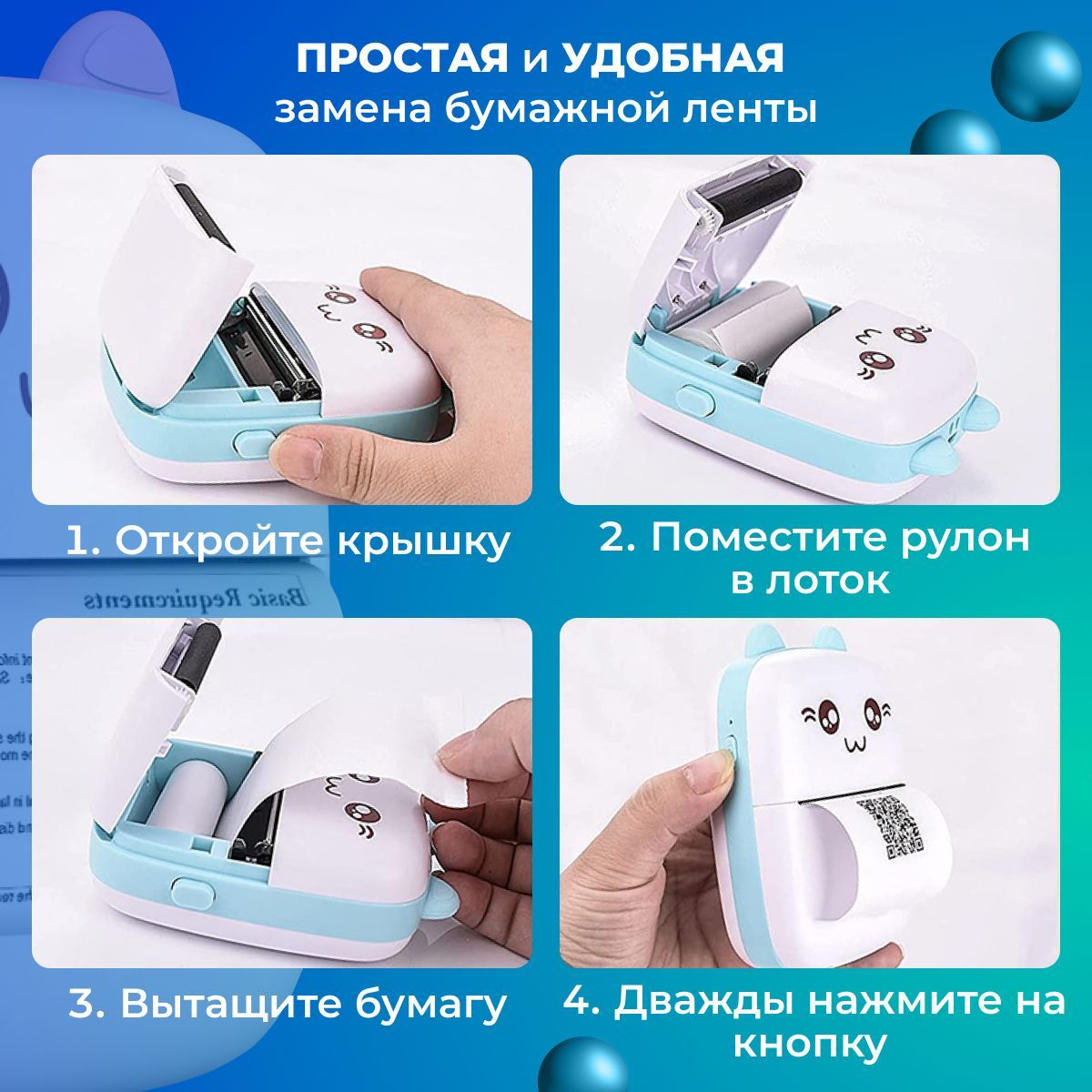 Устройство нужно только зарядить. В комплектацию также входит USB - кабель для зарядки, инструкция на двух языках и сам минипринтер. Современный дизайн пластикового корпуса такой домашней оргтехники понравится и детям, и взрослым. Аккумулятор способен распечатать 4 рулона термобумаги, неприрывно. Благодаря термобумаге, принтер не заправляется и печатает только черно-белые изображения. Для использования термопринтера вам потребуется специальное приложение с одноименным названием и функция Bluetooth на телефоне, ноутбуке или планшете. Сопрягается со всеми устройствами на платформе iOS и Android. Карманный, портативный, мини термопринтер печатает только на термобумаге для чеков или этикетках, которые в дальнейшем можно разместить в вашем любимом альбоме, например для instax mini или любом другом. Для печати на принтере вы можете использовать черно-белую, цветную или даже самоклеящуюся термобумагу, выбирать вам. Максимальный размер бумаги 57х30. При включении принтер покажет вам код который нужно отсканировать.