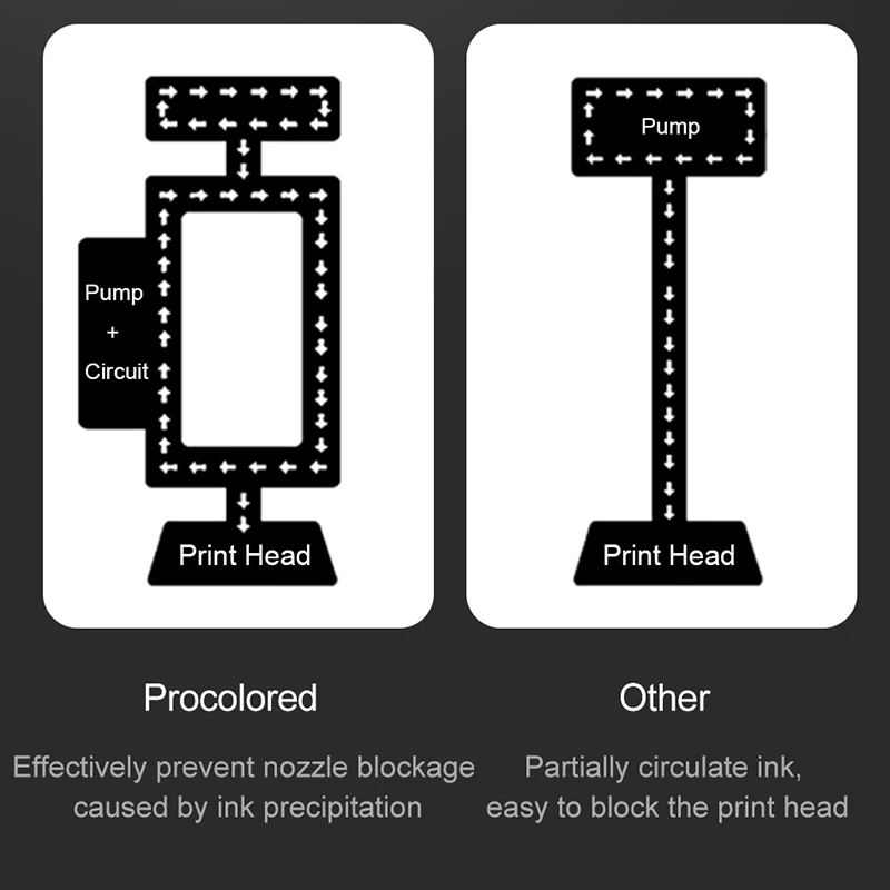 Система циркуляции белых чернил-это наша запатентованная технология, система непрерывной циркуляции эффективно предотвращает засорение сопла, тем самым продлевая срок службы печатающей головки 50% по сравнению с традиционными принтерами.