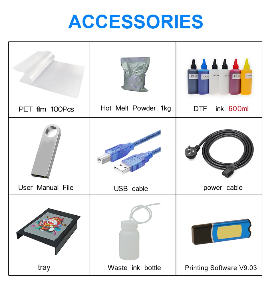 A3 DTF Printer Package 4 R1390 DTF Printer + Software + User Manual + 600ML DTF ink + 1KG DTF Powder +1DTF Roll Film + DTF Oven
