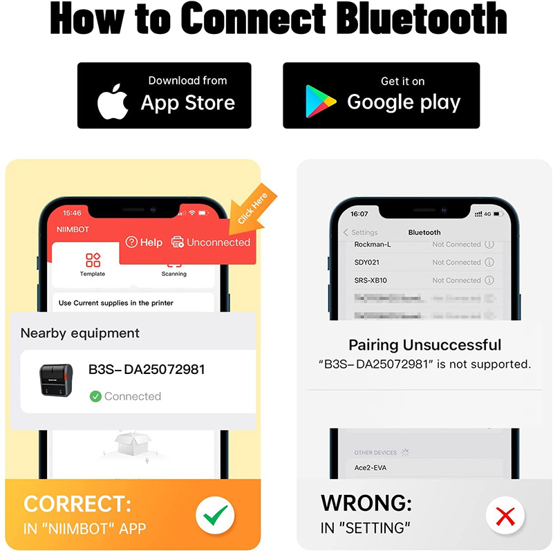 Установите приложение NIIMBOT из Apple Store и Google Play, включите принтер B3S и откройте соединение Bluetooth.