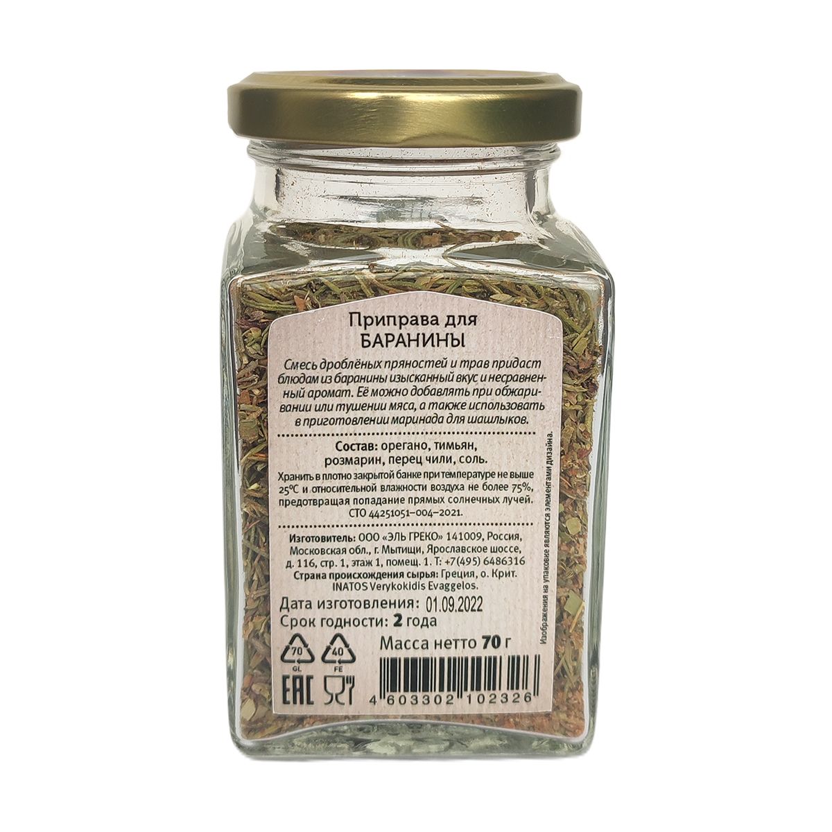 Описание: Приправа для баранины от «Эль Греко» - это идеальное сочетание ароматов и вкусов орегано, тимьяна, розмарина, перца чили и соли. Специи придают мясу насыщенные пряные оттенки. Их можно добавлять при обжаривании или тушении, а также использовать для приготовления маринада для шашлыков. Приправа отлично сочетается с другими специями, такими как: куркума, паприка, кориандр, и с ароматными травами (базиликом, петрушкой).
