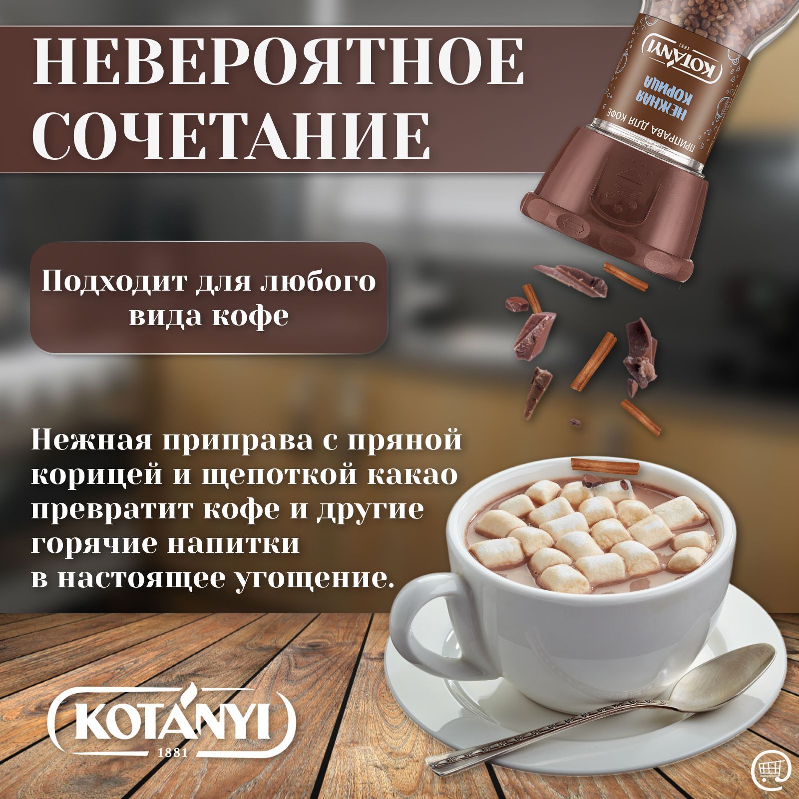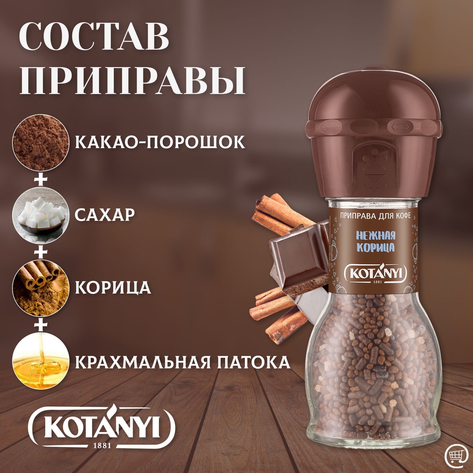 Нежная приправа с пряной корицей и щепоткой какао превратит кофе и другие горячие напитки в настоящее угощение, которое обязательно вам понравится. Нежную корицу от Kotanyi можно использовать в качестве топпинга и подсластителя для любых видов кофе и других горячих напитков, а также мороженого, мюсли, йогурта, блинчиков и различных десертов.