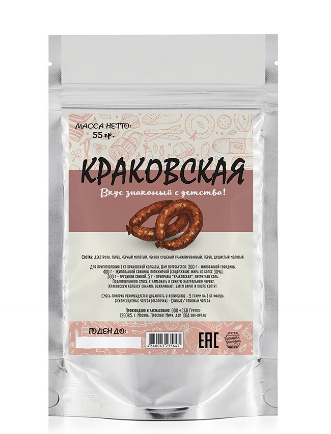 Описание: Приправа для колбасы «Краковская», 55 гр - натуральный набор специй для создания деликатесной колбасы, чей рецепт появился в польском городе Кракове еще в 16 веке. Данную колбасу применяют в кулинарии во множестве стран, ее предпочитают кушать как закуску, а также в бутербродах и сандвичах, идеально сочетается с овощами и зеленью.