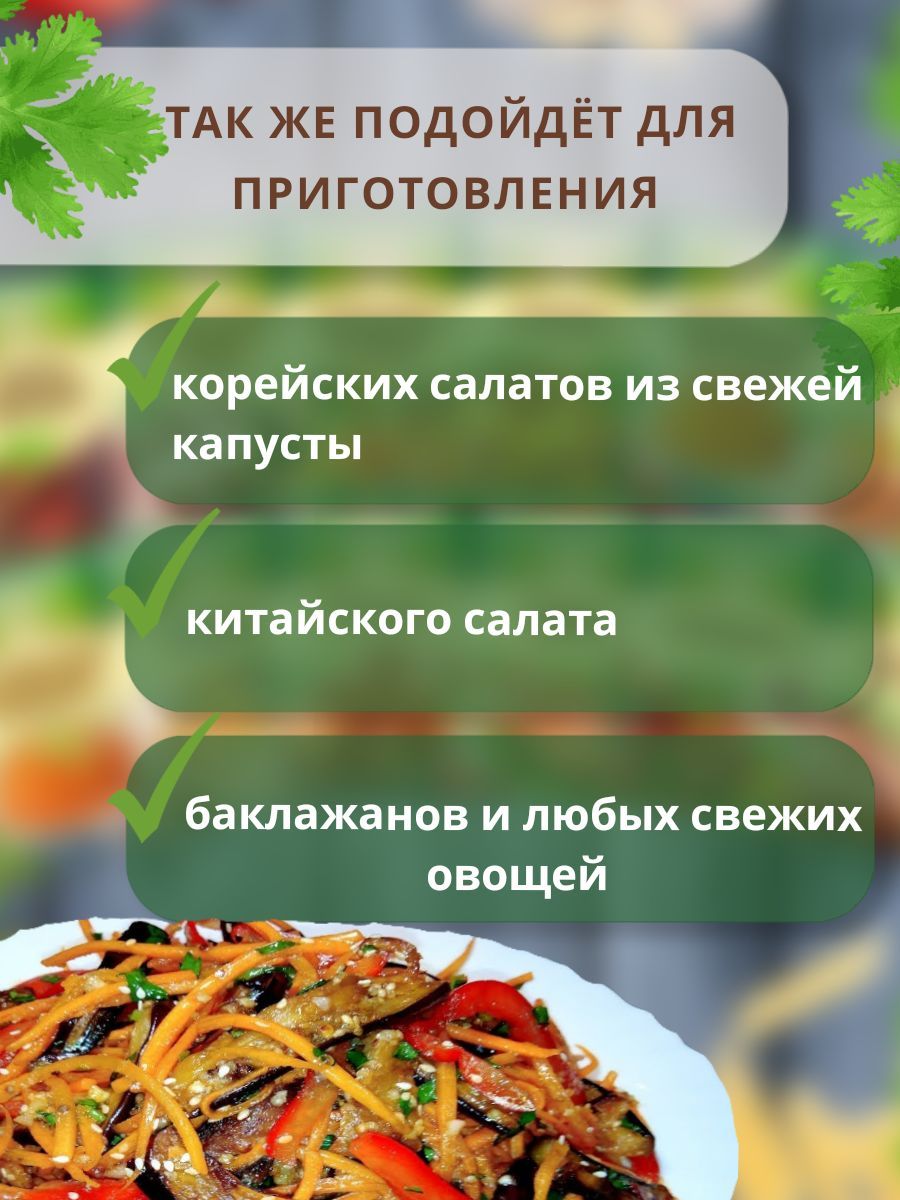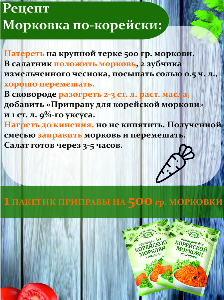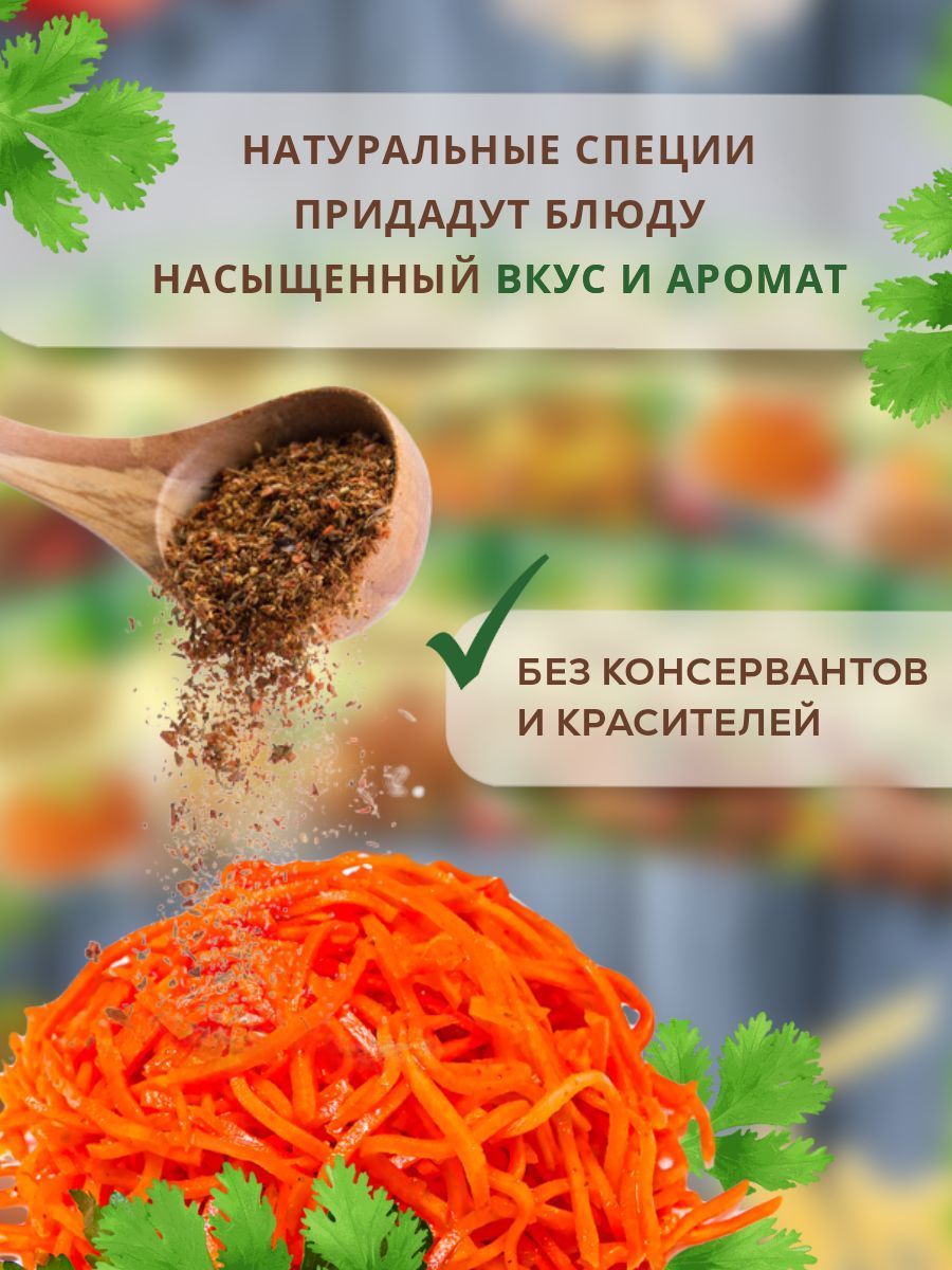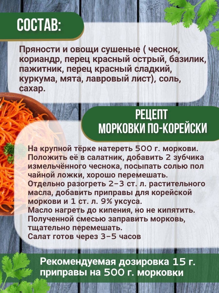 Описание: Приправа для моркови по-корейскиКорейская приправа славится своими яркими вкусами и ароматами, а одним из ключевых рецептов является морковь по-корейски. Приправа для корейской моркови - это ароматная смесь корейских специй, которая придает блюду неповторимый вкус.Способ приготовления: натереть на крупной терке 500 гр. Моркови. В салатник положить морковь, 2 зубчика измельченного чеснока, посыпать солью 0.5 ч. л., хорошо перемешать. В сковороде разогреть 2-3 ст. л. растительного масла, добавить «Приправу для корейской моркови» и 1 ст. л. 9%-го уксуса. Нагреть до кипения, но не кипятить. Полученной смесью заправить морковь, тщательно перемешать. Салат готов через 3-5 часов. Рекомендуемая дозировка 15 гр.