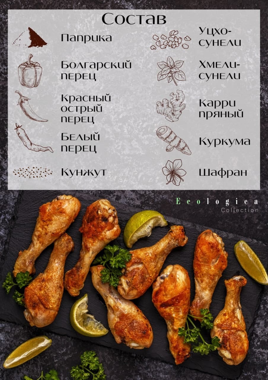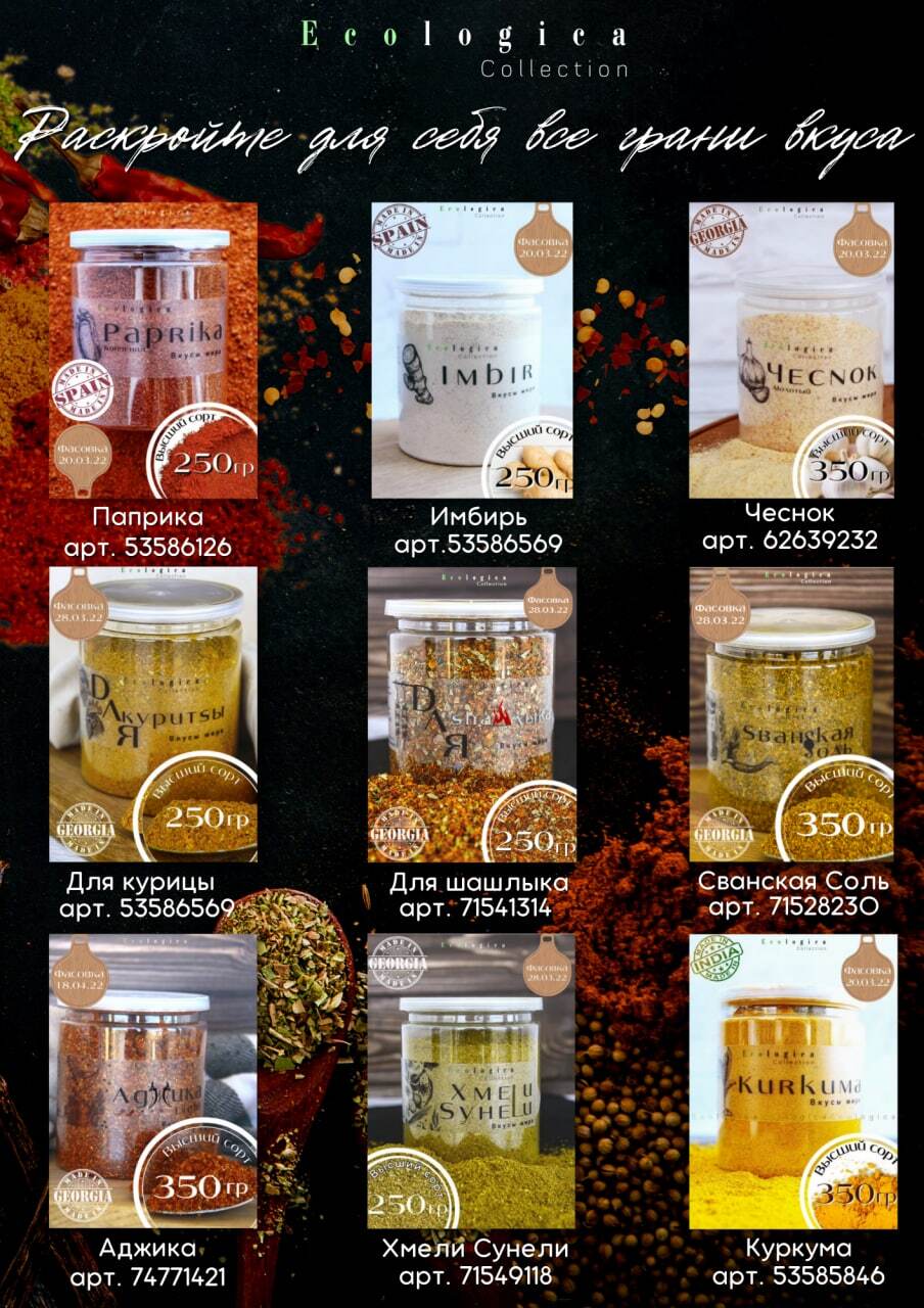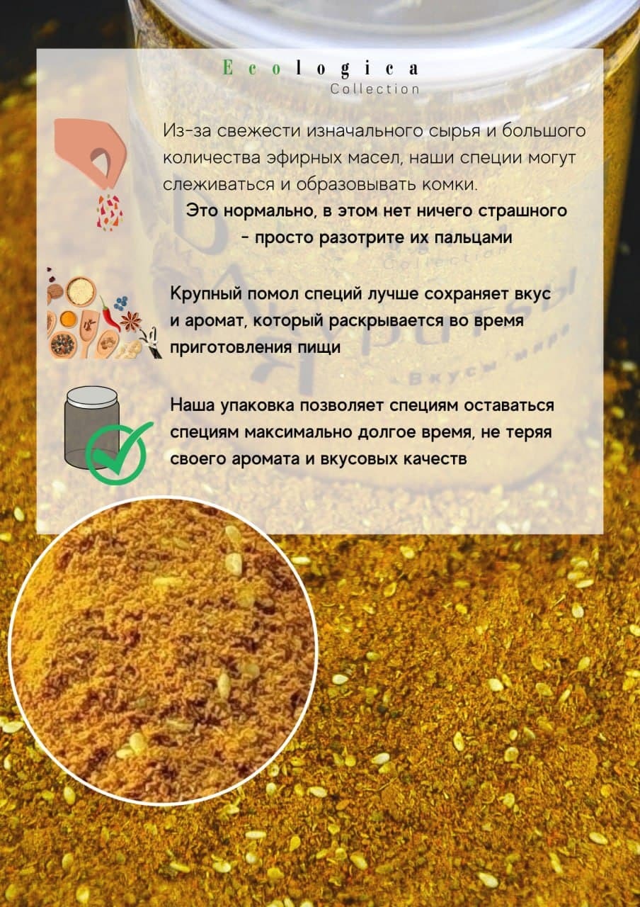 Описание: Наши приправы и специи это продукты растительного происхождения, уникальная авторская смесь органических специй БЕЗ добавления ГЛУТАМАТА НАТРИЯ. Смесь специй является уникальным товаром из солнечной Грузии. Идеально подходит как набор специй и приправ не только для курицы, но и специи для колбасы, для супа, ухи, гриль, из нее выйдет отличная приправа для шашлыка, универсальная приправа для мяса и приправа для утки. Достоверно известный факт, грузинские пряности и специи это великолепные специи для шашлыка, универсальная приправа к любым блюдам. Приправа подойдет для приготовления цыпленка табака, сочетается с любым видом мяса, колбасой и овощами, поскольку содержит универсальные специи в своем составе, которые ценятся не первый век и содержат натуральные ингредиенты, которые не уступают по вкусу таким приправам как индийские специи и китайские специи. Приправы в банках идеальны для хранения специй. Попробуйте наши специи в банках, порадуйте себя и своих близких. Пусть Ваши блюда заиграют новыми красками!