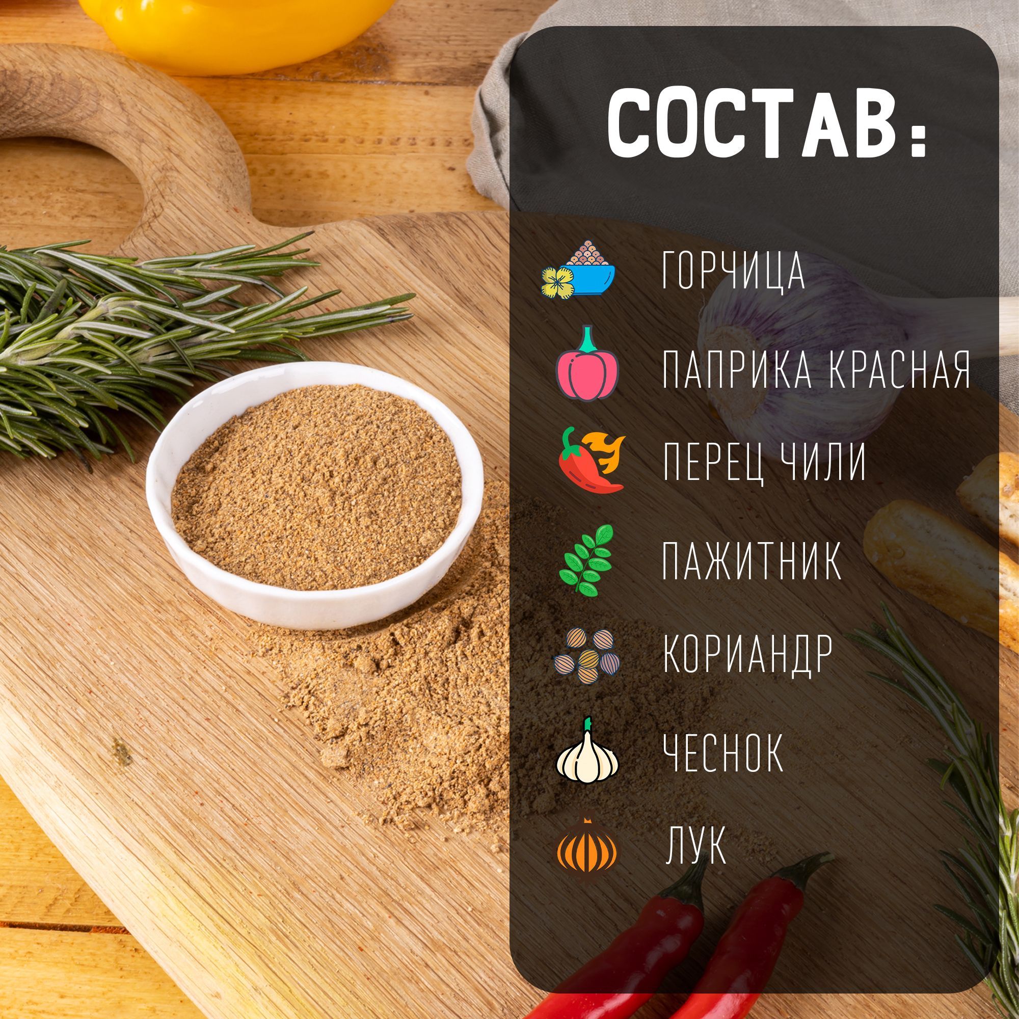 Кориандр молотый, горчичный порошок, паприка красная сладкая, чеснок гранулированный, перец чили молотый, пажитник молотый, лук молотый