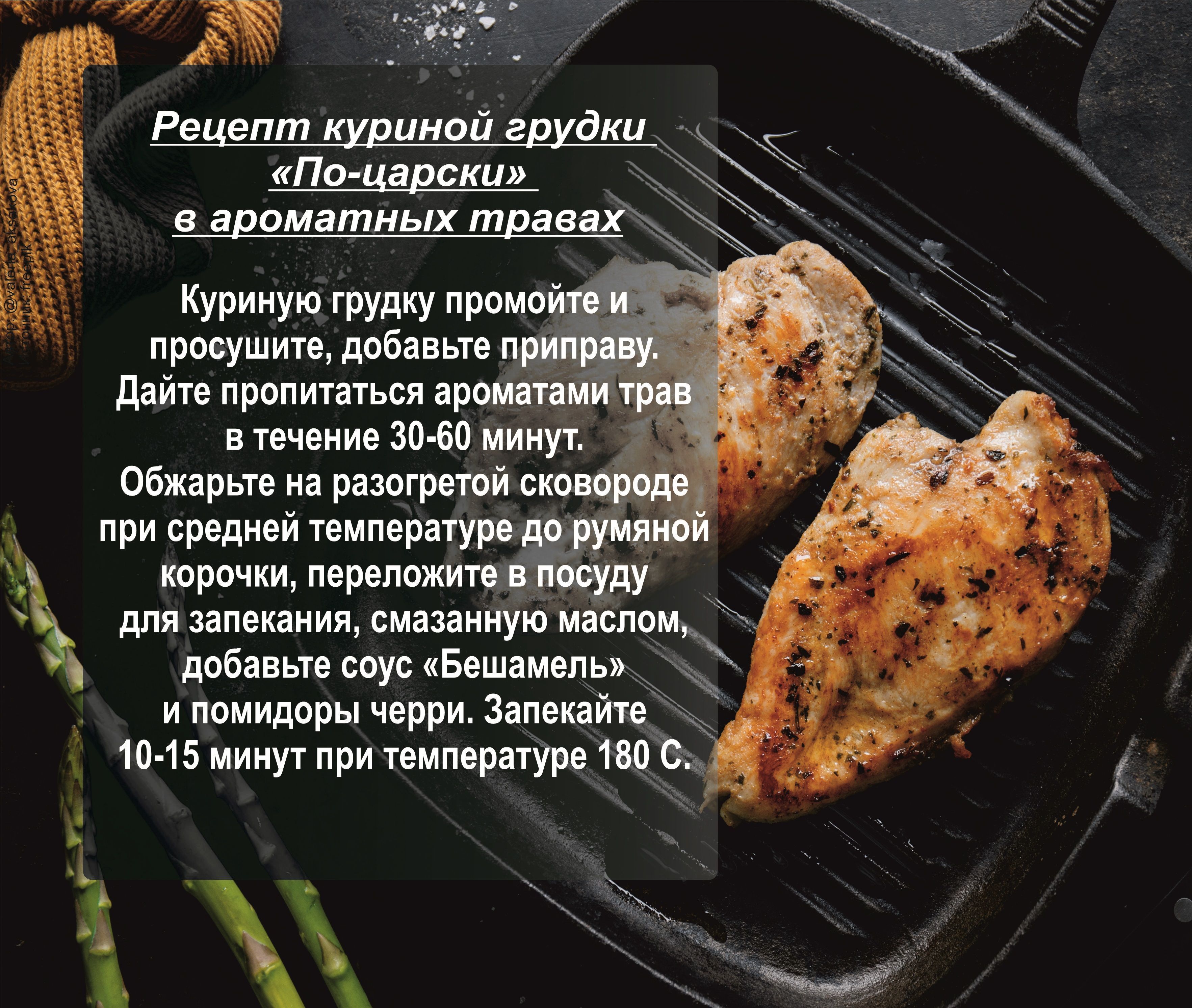 Куриная грудка «Царская» в ароматных травахСпособ приготовления: Куриную грудку промойте и просушите, добавьте приправу. Дайте пропитаться ароматами трав в течение 30-60 минут. Обжарьте на разогретой сковороде при средней температуре до румяной корочки, переложите в посуду для запекания, смазанную маслом, добавьте соус «Бешамель» и помидоры черри. Запекайте 10-15 минут при температуре 180С.