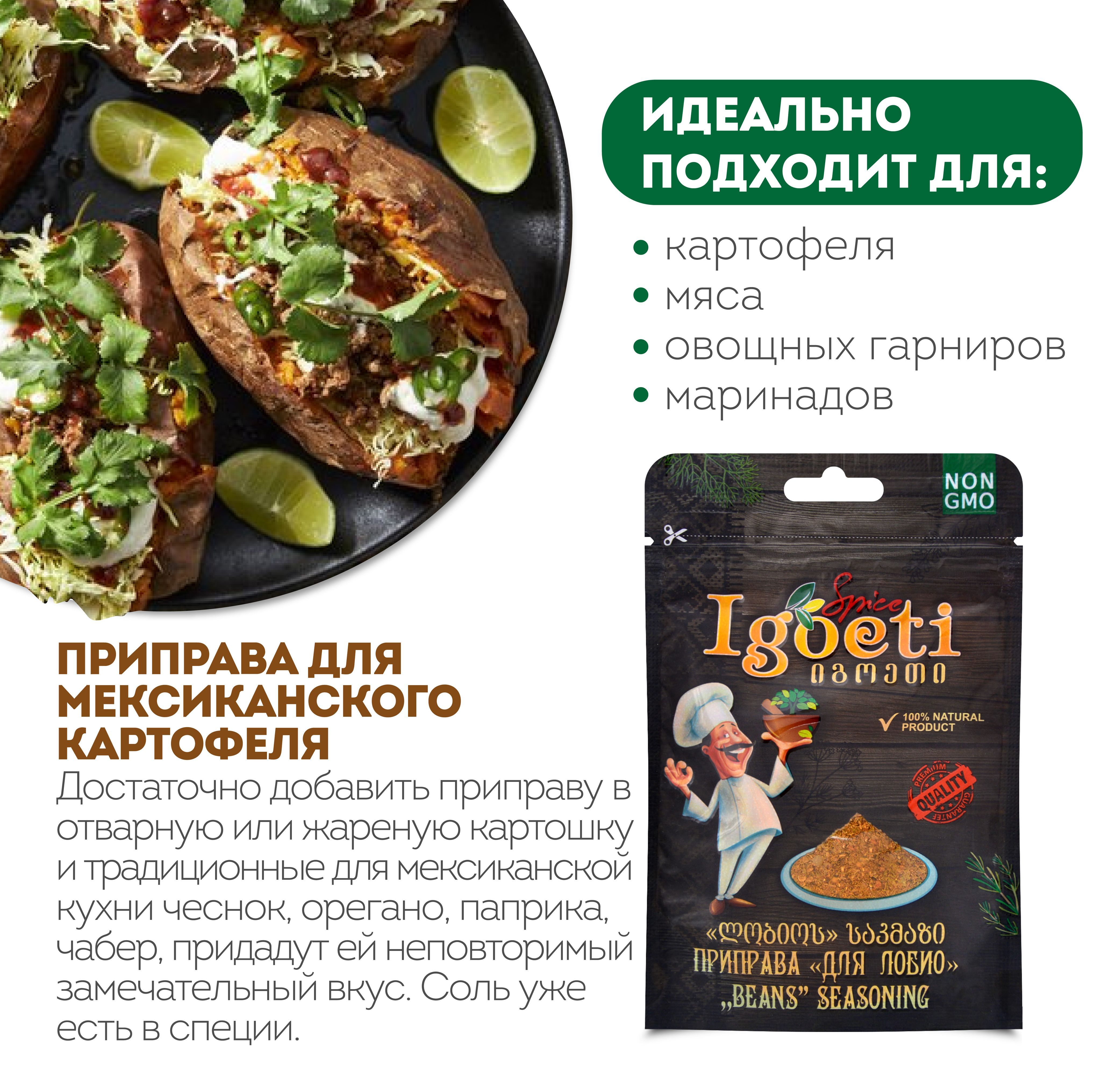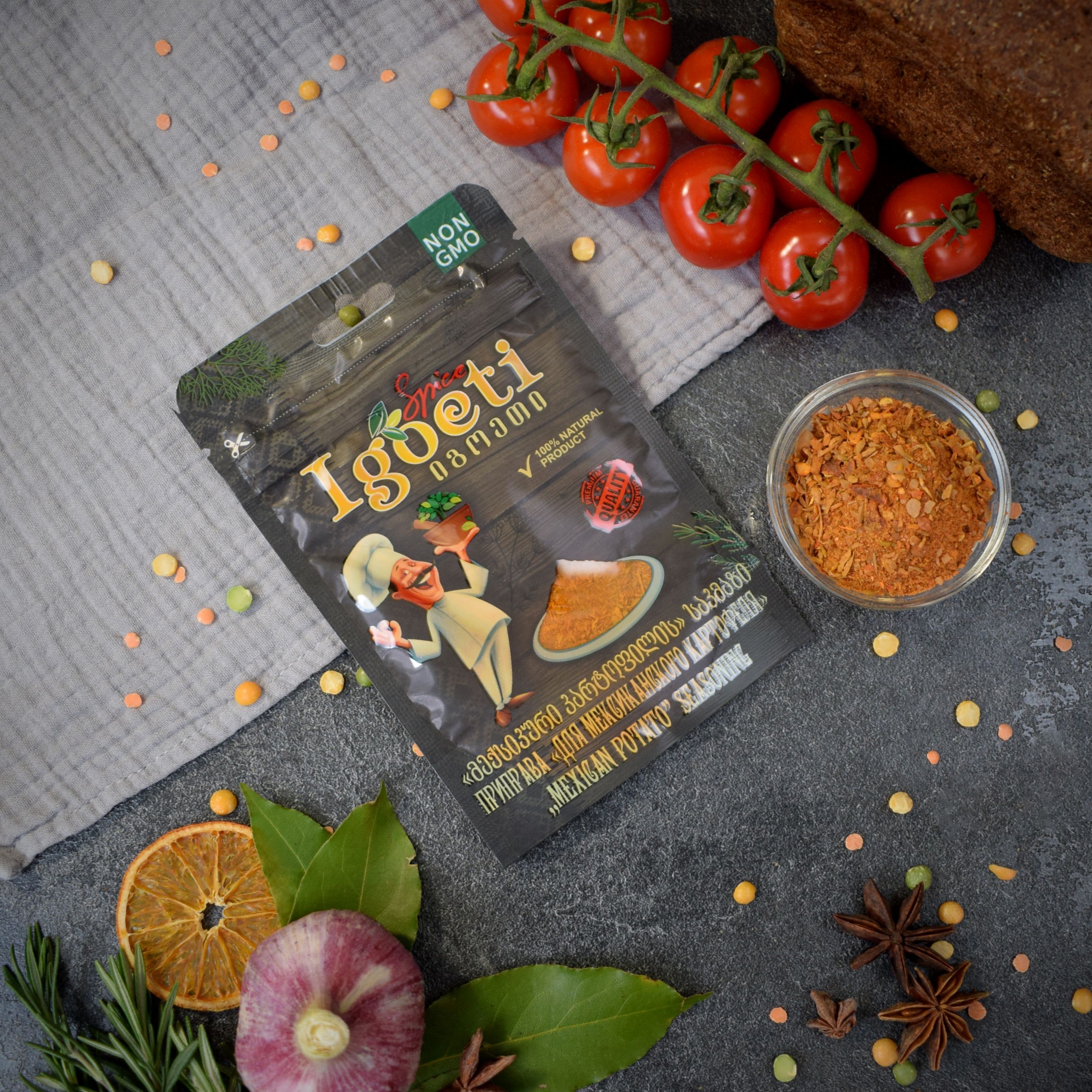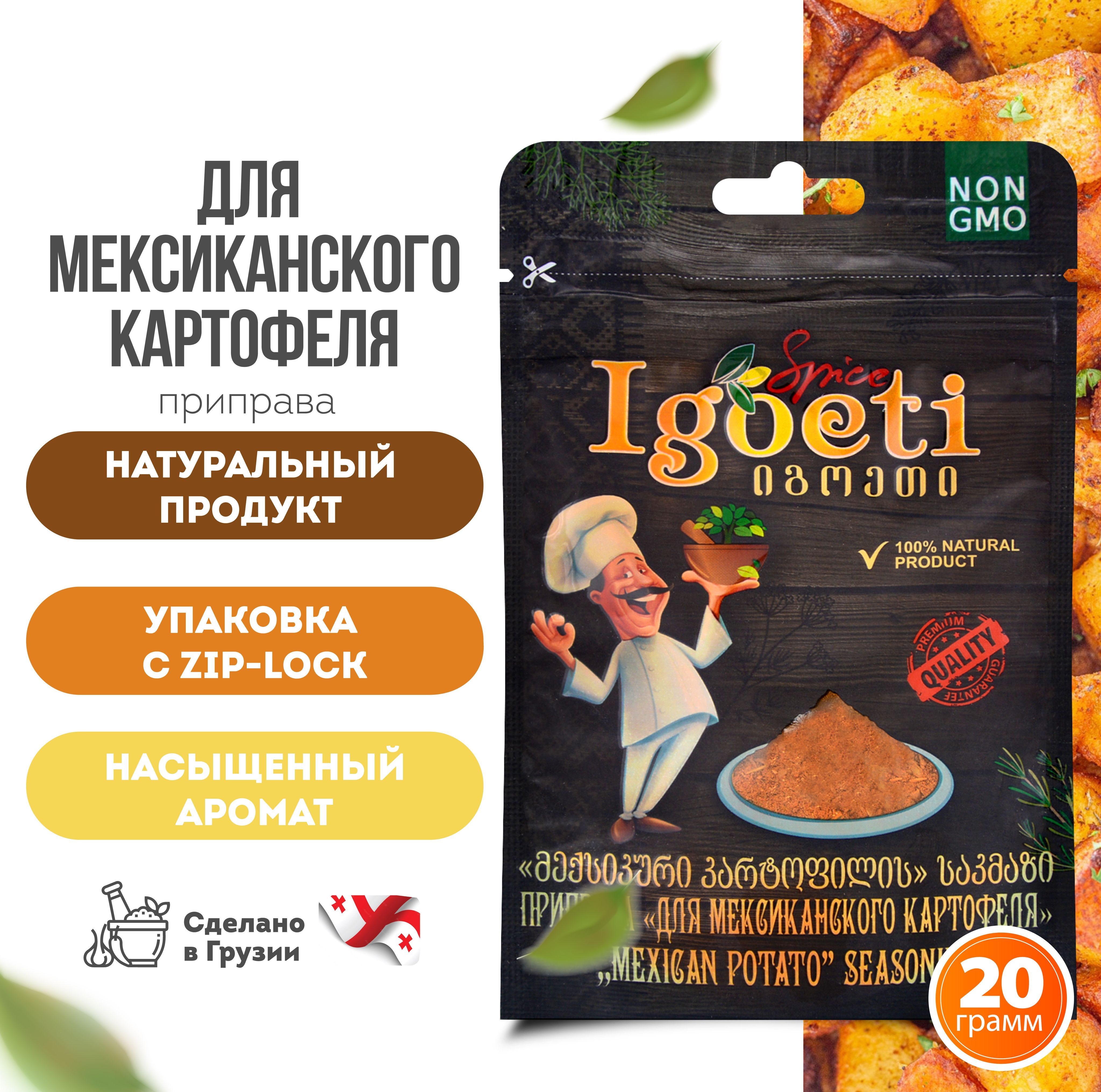 Благодаря тому, что соль уже содержится в специи, вам не придется добавлять ее отдельно.Попробуйте приправу для мексиканского картофеля от Spice Igoeti и приготовьте что-то новое и необычное для своей семьи! Приправу можно использовать для приготовления различных блюд, включая мясо, птицу, рыбу, овощи, макароны и крупы, а также для соусов, консервов и маринадов. Кроме того, Spice Igoeti не содержит искусственных красителей, консервантов и ароматизаторов. Это делает ее безопасной для здоровья и пригодной для употребления в пищу.Специя также отлично подойдет как для приготовления мяса, птицы, овощных гарниров и рыбы, так и для различных маринадов, соусов и консерваций.Попробуйте и другие натуральные специи и приправы из Грузии.