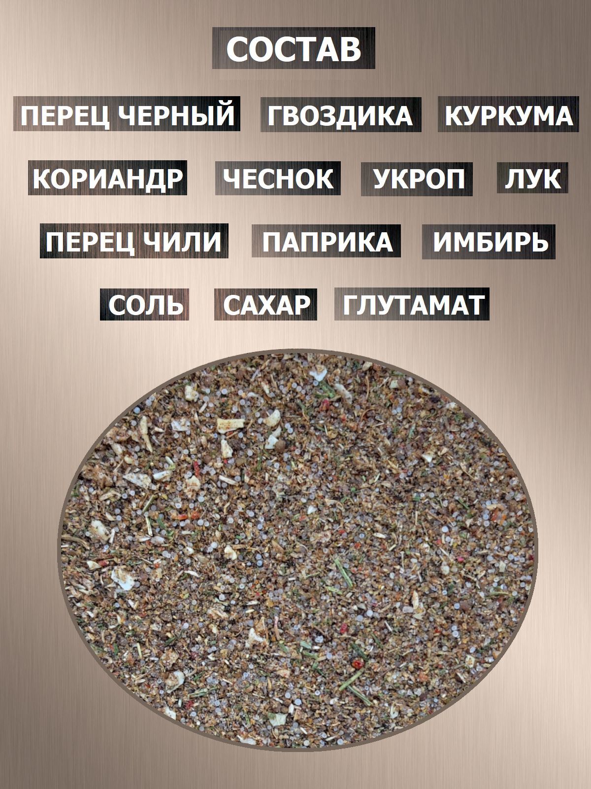 Соль, кориандр, чеснок, укроп, лук, глутамат, сахар, перец чили, паприка, имбирь