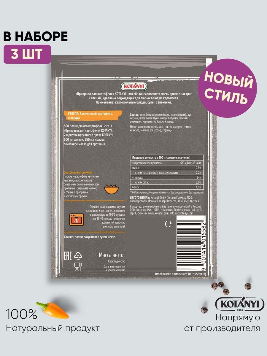 Описание: Приправа для моркови по-корейски KOTANYI 20г - 3шт. Острая и пряная морковь по-корейски - это идеальная закуска как для повседневного ужина, так и для праздничного стола. Кориандр, имбирь, чили и другие специи придают моркови традиционный пикантный вкус. Состав: сахар, соль йодированная (соль, калия йодид), чеснок, лук, кориандр, паприка, имбирь, чили. Пищевая ценность (средние значения) в 100 г: энергетическая ценность: 1249 кДж/297 ккал, белки 7,5 г; жиры 4,3 г; углеводы 50 г