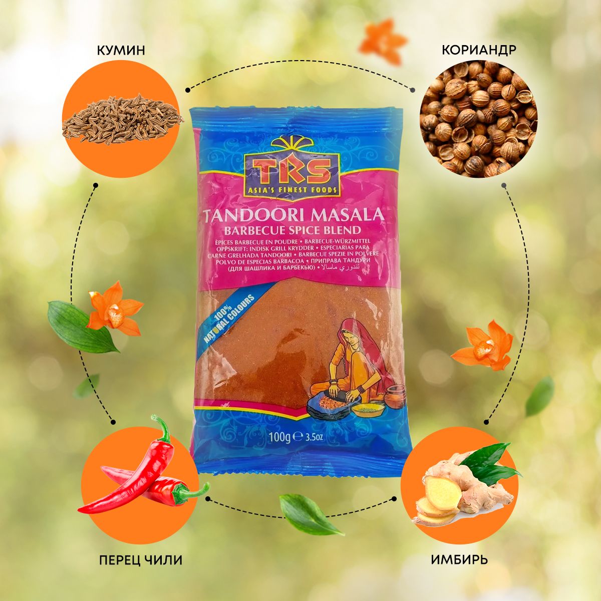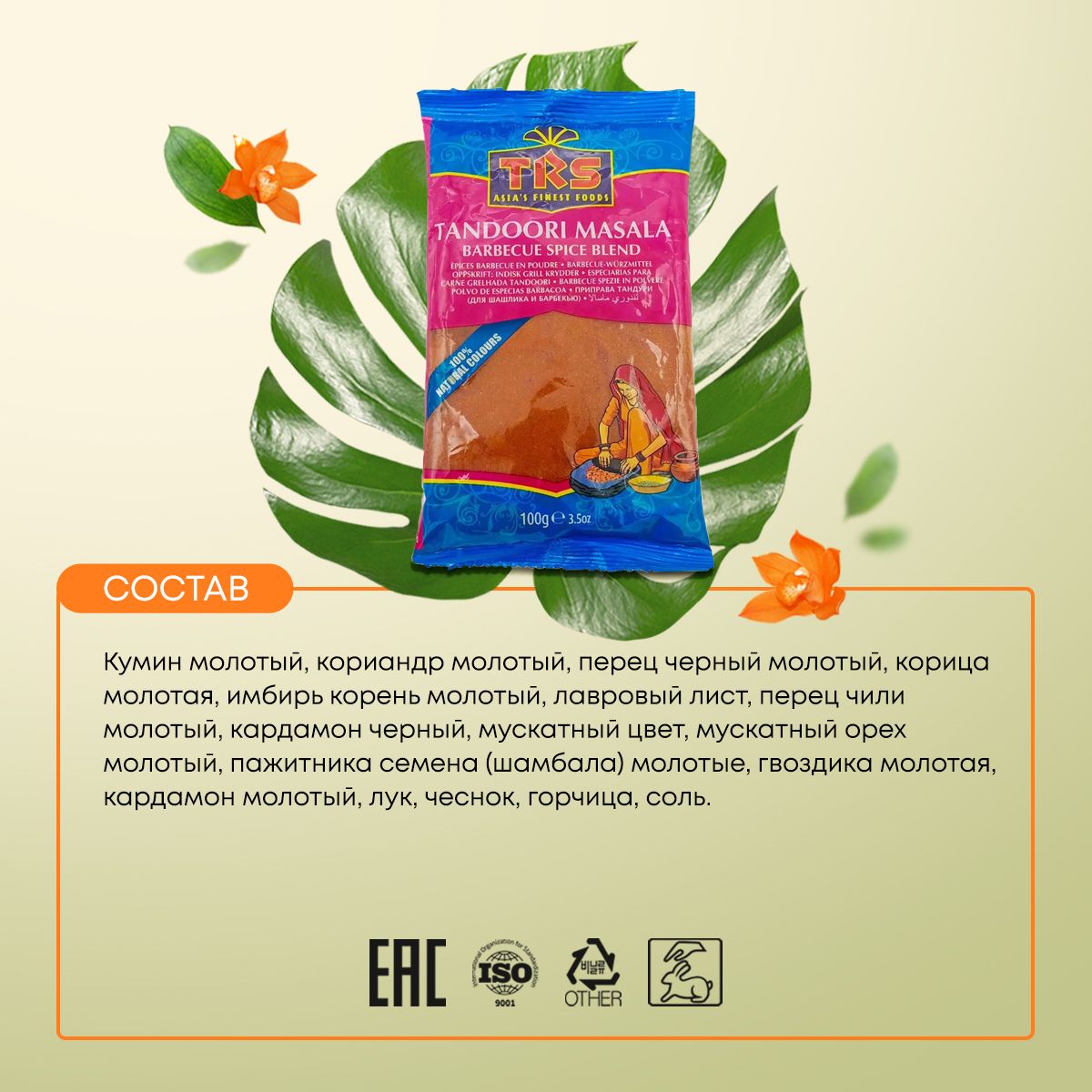 Описание: Приправа для шашлыка | Tandoori masala TRS | Тандури масала ТРС - восхитительная смесь для приготовления мясных и рыбных блюд в традиционной индийской печи тандури. Этот микс пряностей делает любое мясо мягким и сочным, раскрывает его уникальный вкус и аромат. Способ применения: тандури масала - идеальная смесь специй для приготовления маринадов к мясным продуктам. Попробуйте сделать настоящего “цыпленка по-пенджабски”. Смешайте приправу с кефиром или йогуртом и маринуйте мясо или птицу в течение 5-6 часов в прохладном месте. После этого выпекайте его в духовке при температуре 200-250 градусов не менее получаса.