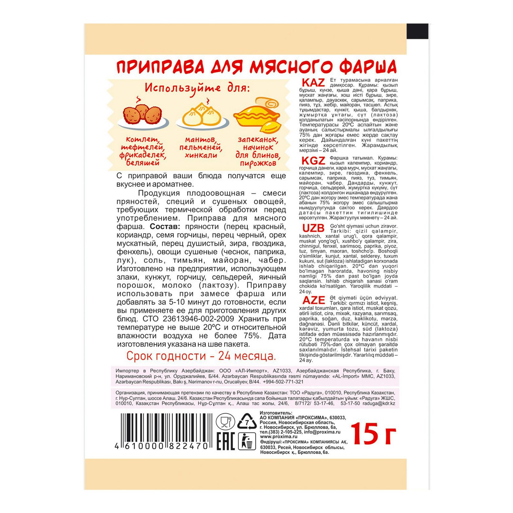 Описание: Приправа для мясного фаршаИз мясного фарша вы можете приготовить котлеты, тефтели, пельмени, манты, запеканки, начинки для блинов и пирожков. И конечно, тут не обойтись без Приправы для мясного фарша от Приправыча. С приправой ваши блюда получатся еще вкуснее и ароматнее. Приправу добавлять при замесе фарша или посыпать блюда приправой за 5-10 минут до их готовности. Состав: пряности (перец красный, кориандр, семя горчицы, перец черный, орех мускатный, перец душистый, зира, гвоздика, фенхель), овощи сушеные (чеснок, паприка, лук), соль, тимьян, майоран, чабер.