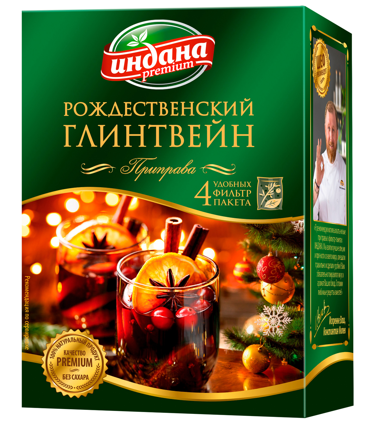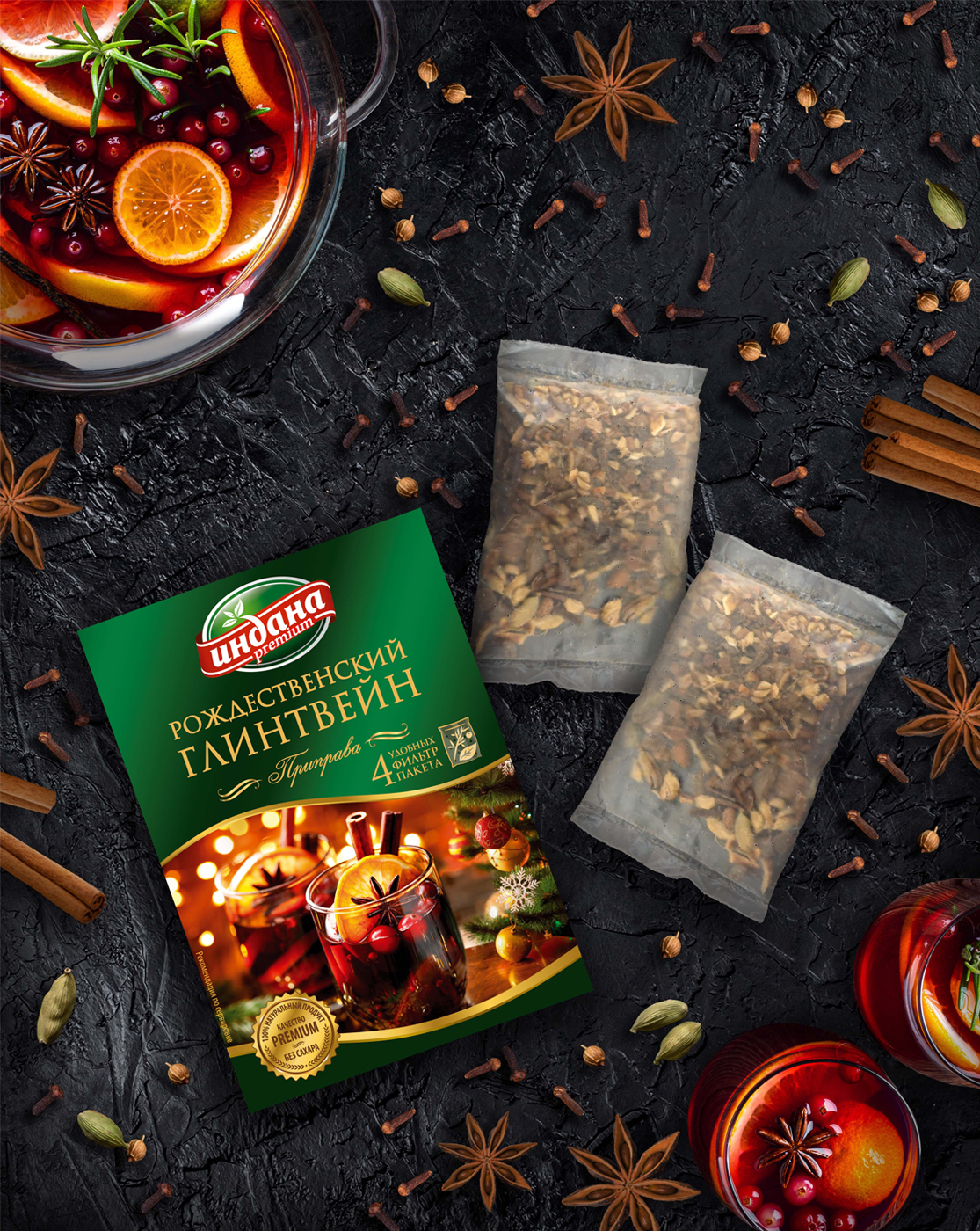 Приправа для напитков Рождественский глинтвейн корица имбирь гвоздика кардамон изюм цедра апельсиновая бадьян ТМ Индана Премиум 60 гр., 4*15 гр. фильтр- пакета.