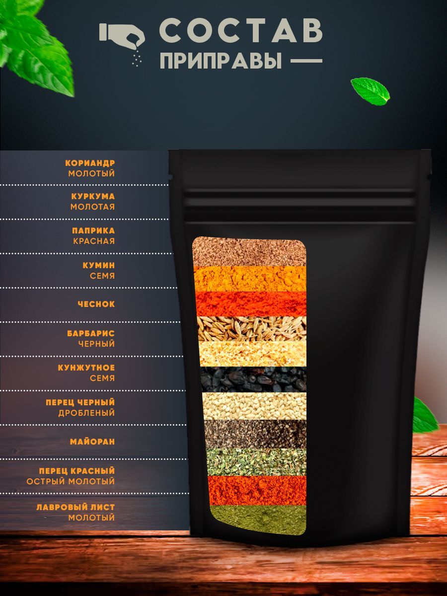 кориандр молотый, куркума молотая, паприка красная молотая, чеснок, барбарис черный, кунжутное семя белое, перец черный, майоран, перец красный острый, лавровый лист молотый, кумин семя (зира)