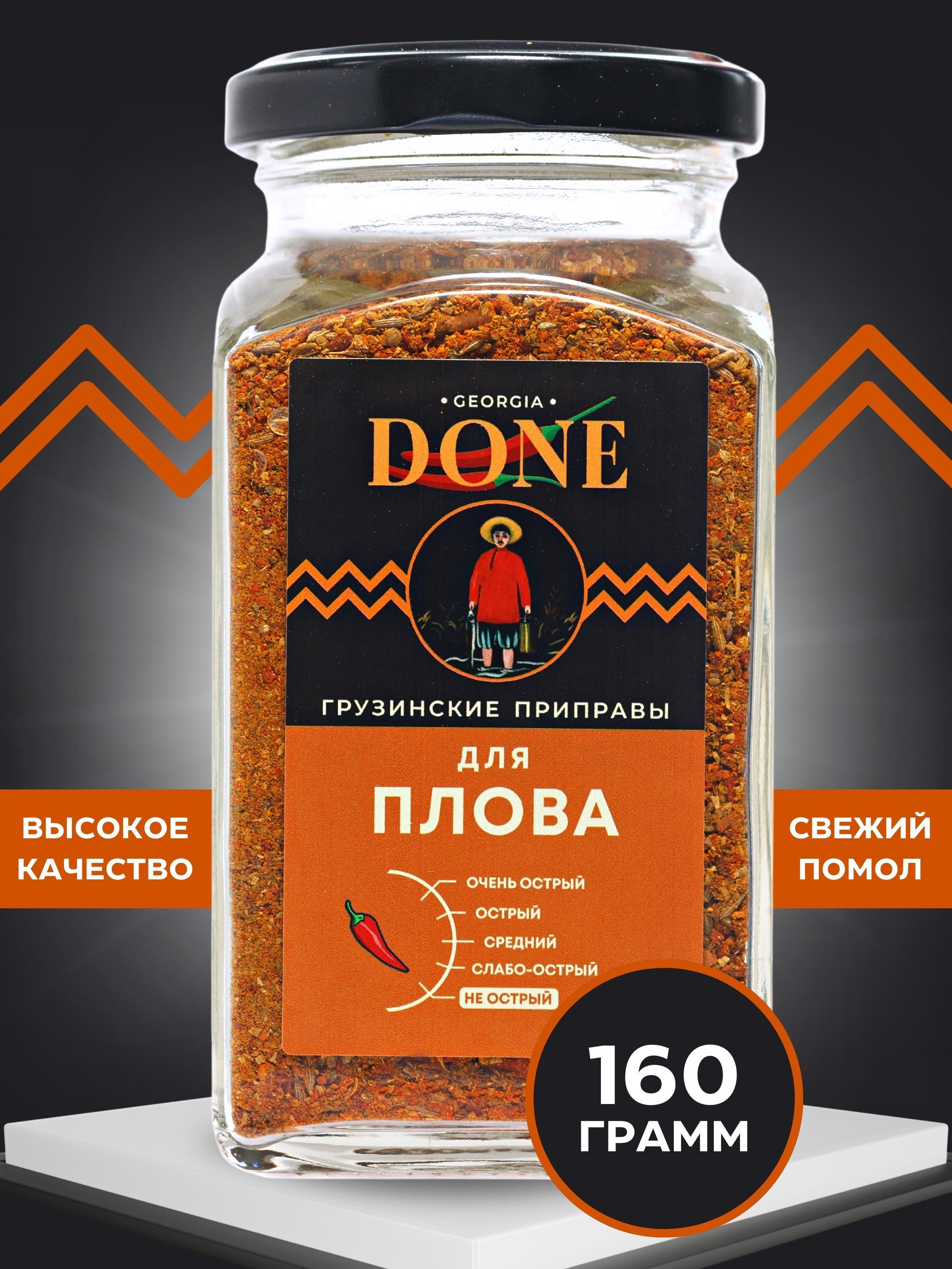 Описание: Плов - национальное восточное блюдо из варёного риса с жиром, кусочками мяса (или рыбы) и со специями. Приправа для плова придает блюду неповторимый, несравнимый сильный, притягательный аромат и уникальный вкус сытного блюда, популярного не только на Востоке, но и во всем мире. Специи для плова готовят из высушенных и измельченных овощей и пряностей. В состав приправы входят паприка, кумин, зира семена, кориандр, куркума, шафран, барбарис, хмели-сунели. Зира дает блюду характерный аромат и остроту, барбарис обогащает кислинкой, шафран окрашивает в приятный желтый цвет. Кумин содержит в себе камедь, белок, фосфор, кальций, витамины группы В и С. Он возбуждает аппетит, помогает при бессоннице, улучшает пищеварение, благотворно влияет на сердечно-сосудистую систему. Шафран способствует улучшению пищеварения, выработке серотонина - гормона счастья, очищает лимфу, сосуды. Приправа для плова сдерживает чувство голода долгое время, ускоряет обмен веществ и обладает общеукрепляющим действием. Соберите свой набор специй с пряностями и приправами DONE откройте для себя вкусы со всего мира . Универсальные  приправы в банках незаменимые помощники хозяйки или хозяина на кухне, а качество и аромат свежесмолотых специй ДОНЕ по праву ценят шеф-повара лучших ресторанов Москвы. Мы будем рады вашим отзывам, фотографиям блюд и будем особенно благодарны, если вы добавите наш бренд в избранное, потому что нам есть чем вас удивить! Выбирайте лучшие грузинские специи!