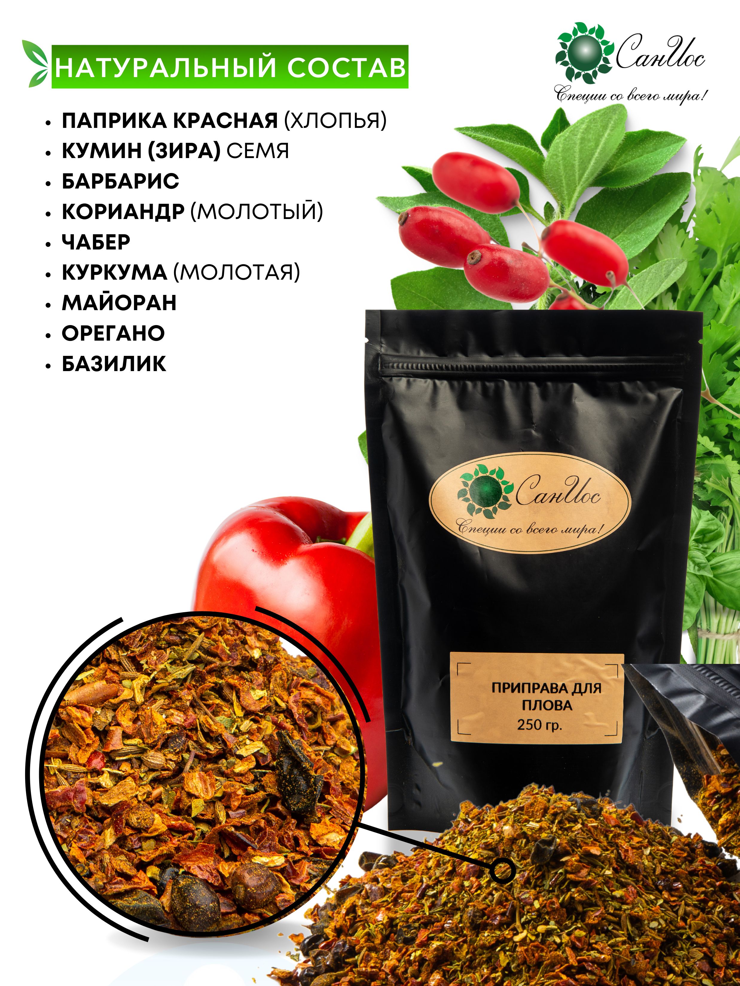 паприка красная хлопья, кумин семя, барбарис, кориандр молотый, чабер, куркума молотая, майоран, орегано, базилик