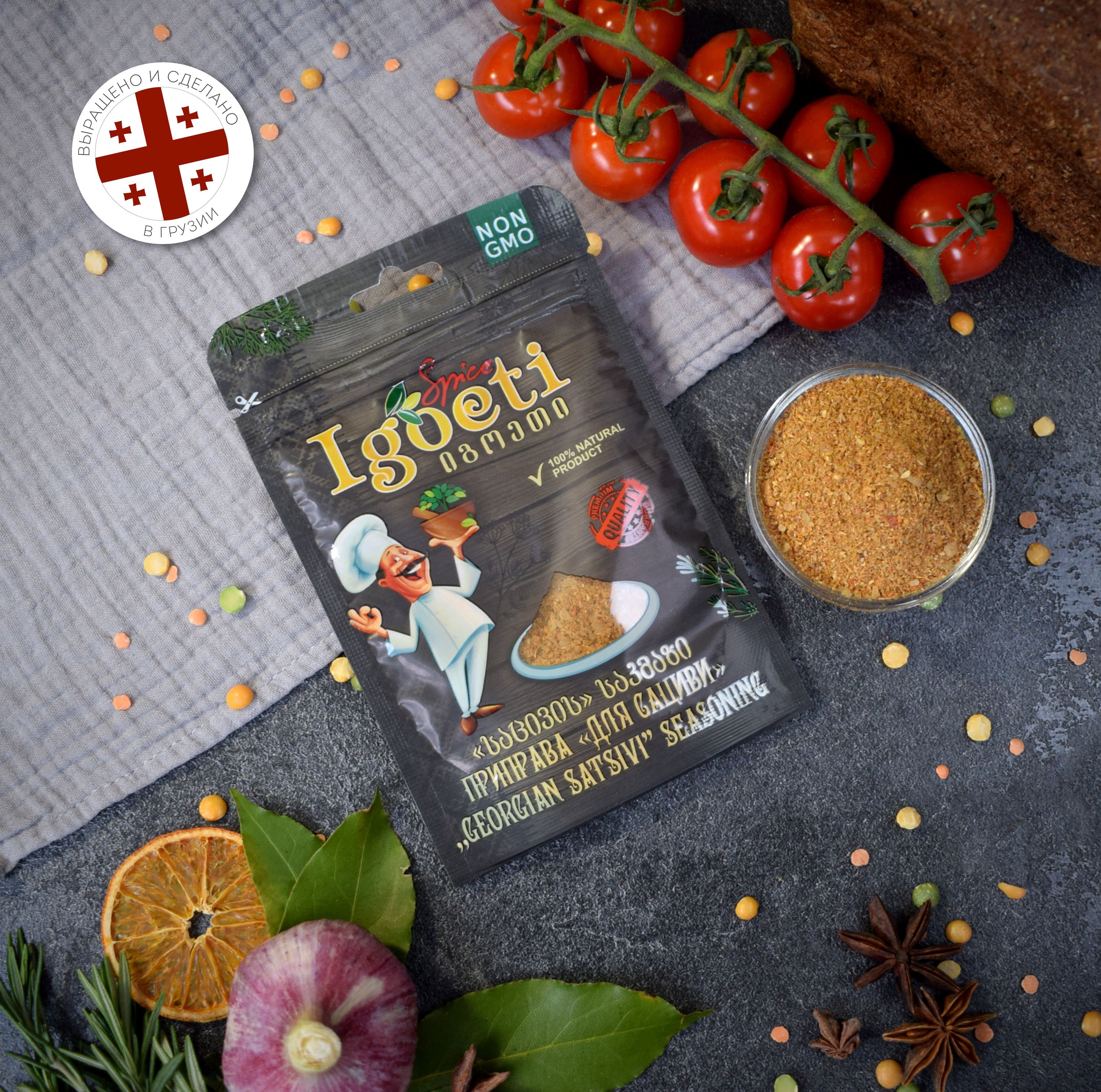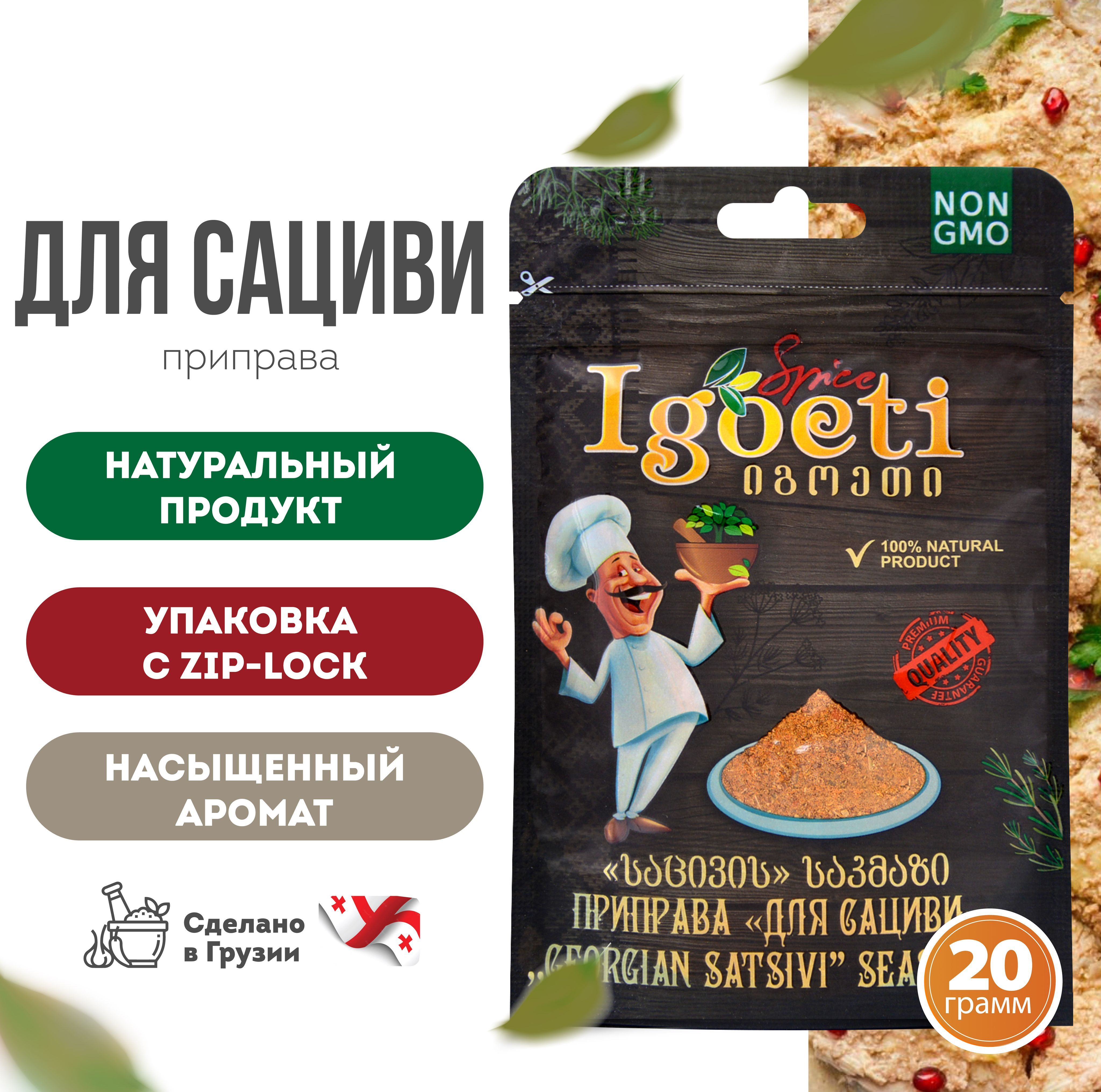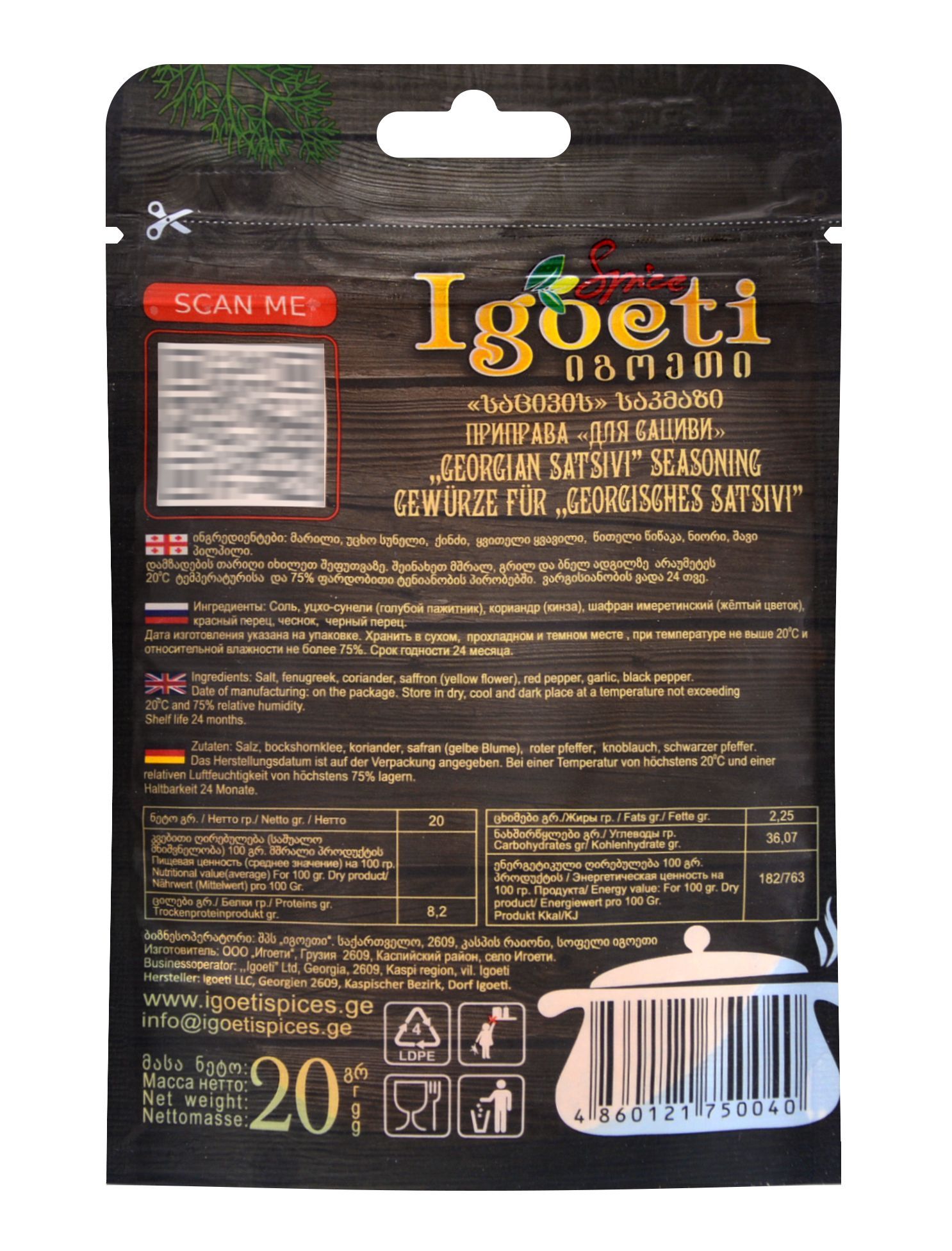 Специи не содержат ароматизаторов, консервантов, и искусственных красителей.Бренд Spice Igoeti предлагает вам купить приправу для сациви в упаковке 20 гр. Она состоит из соли, сцхо-сунелли (голубого пажитника), кориандра (кинзы), шафрана имеретинского (желтого цветка), красного перца, чеснока, черного перца.