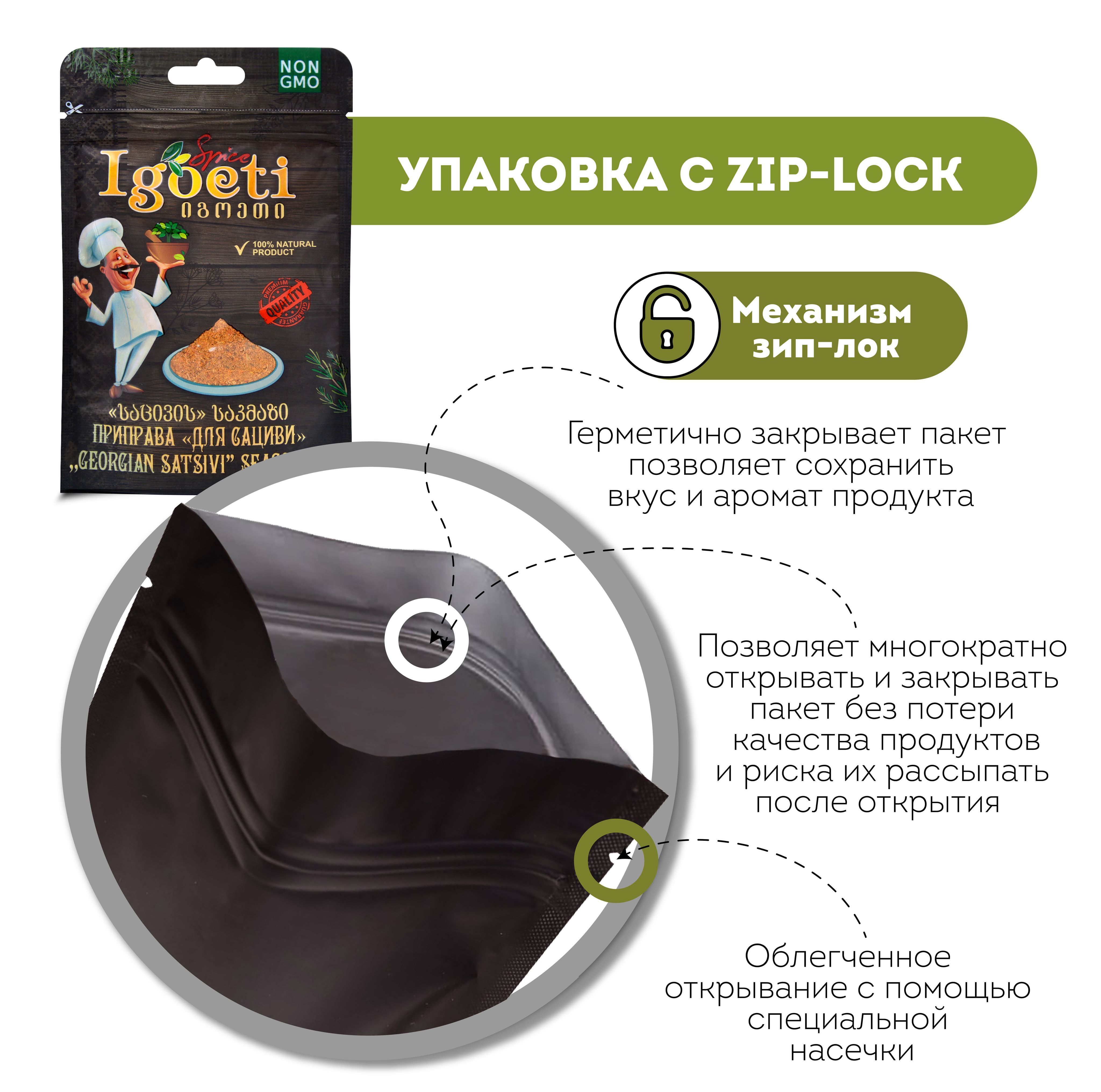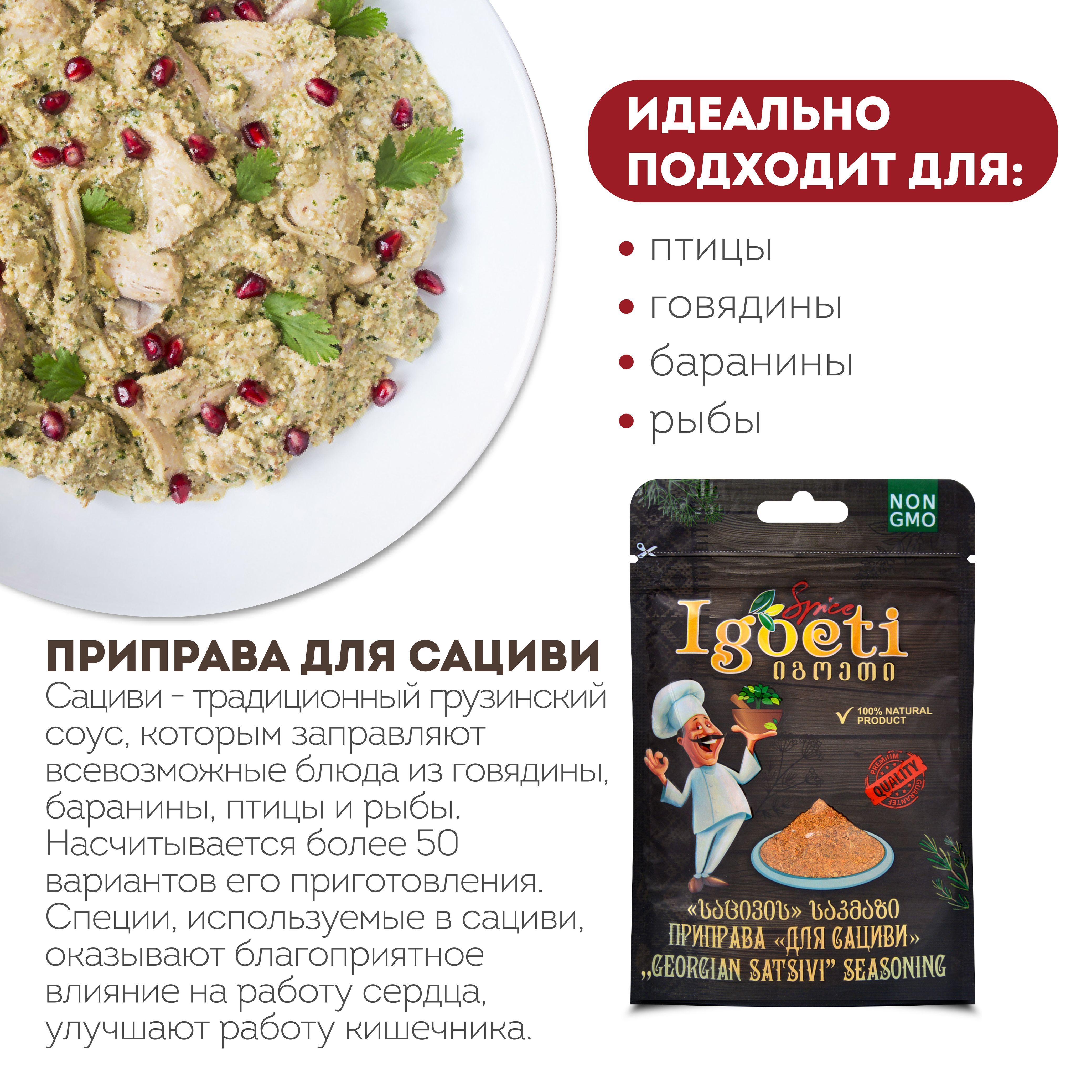 Описание: Сациви - традиционный грузинский соус, которым заправляют всевозможные блюда из говядины, баранины, птицы и рыбы. Насчитывается более 50 вариантов его приготовления. Специи, используемые в сациви, оказывают благоприятное влияние на работу сердца, улучшают работу кишечника. Сациви богато минеральными веществами и витаминами А, Е и В.Упаковка с удобным механизмом открытия/закрытия зип-лок.