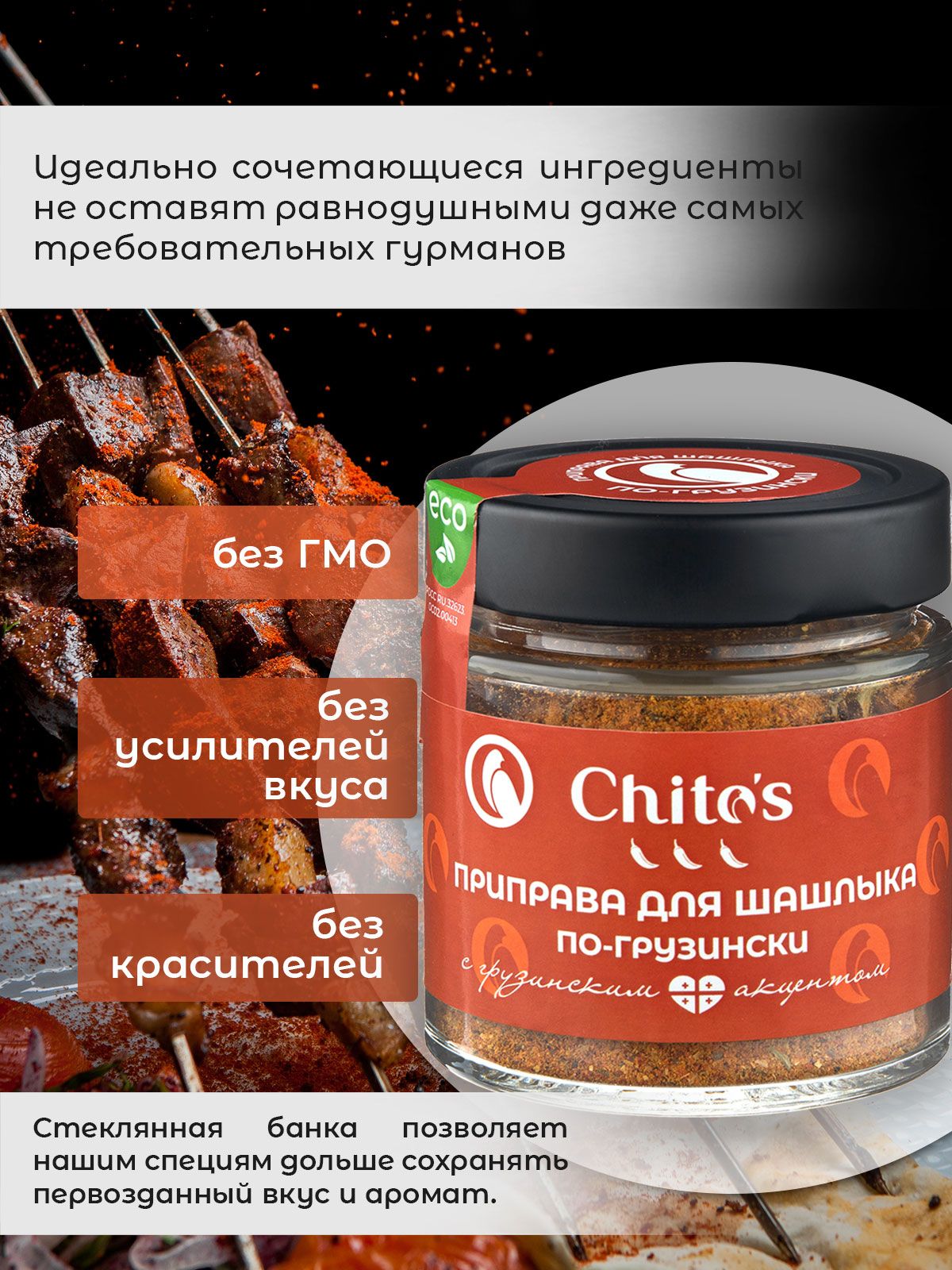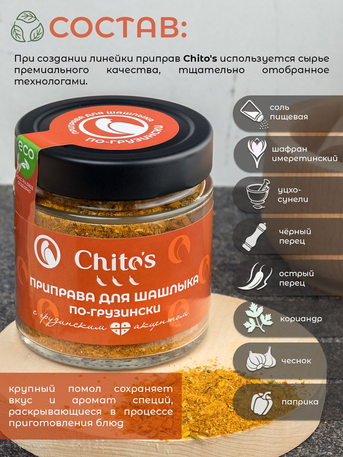 Описание: Приправа для шашлыка «CHITO’S.» Универсальная приправа, сочетающая в себе соль и специи, характерные для блюд грузинской кухни. Используйте эту приправу по своим предпочтениям - для приготовления своих кулинарных шедевров. Она отлично подойдет для жарки мяса, птицы, рыбы и морепродуктов на гриле, мангале, барбекю, как на природе, так и в домашних условиях - в духовке. Использование нашей приправы улучшат вкус готового блюда. Приправой можно натереть большой кусок мяса, рыбы или птицы перед жаркой или запеканием, использовать её как основы для маринада, добавив к приправе минеральную воду лимон. Если готовите тушёные или варёные блюда, то приправу обычно добавляют в конце приготовления, чтобы вкус и аромат раскрылись более насыщенно