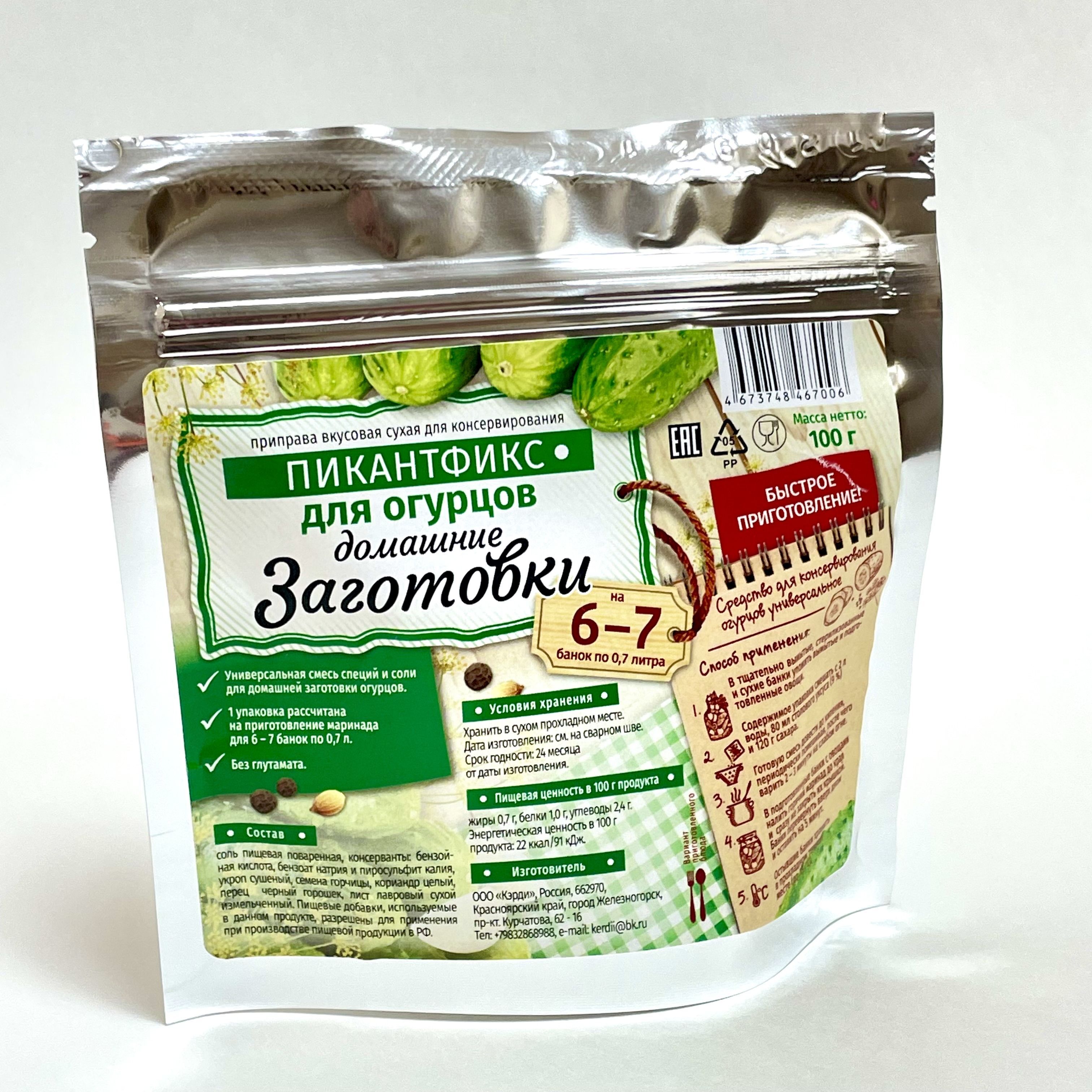 Описание: Уникальная универсальная приправа для быстрого и легкого консервирования огурцов. В упаковке уже содержаться все необходимые компоненты, а сам процесс консервации занимает несколько минут. И готовые огурчики без дополнительной стерилизации могут храниться не в погребе или холодильнике, а просто в прохладном (до +20С) месте!