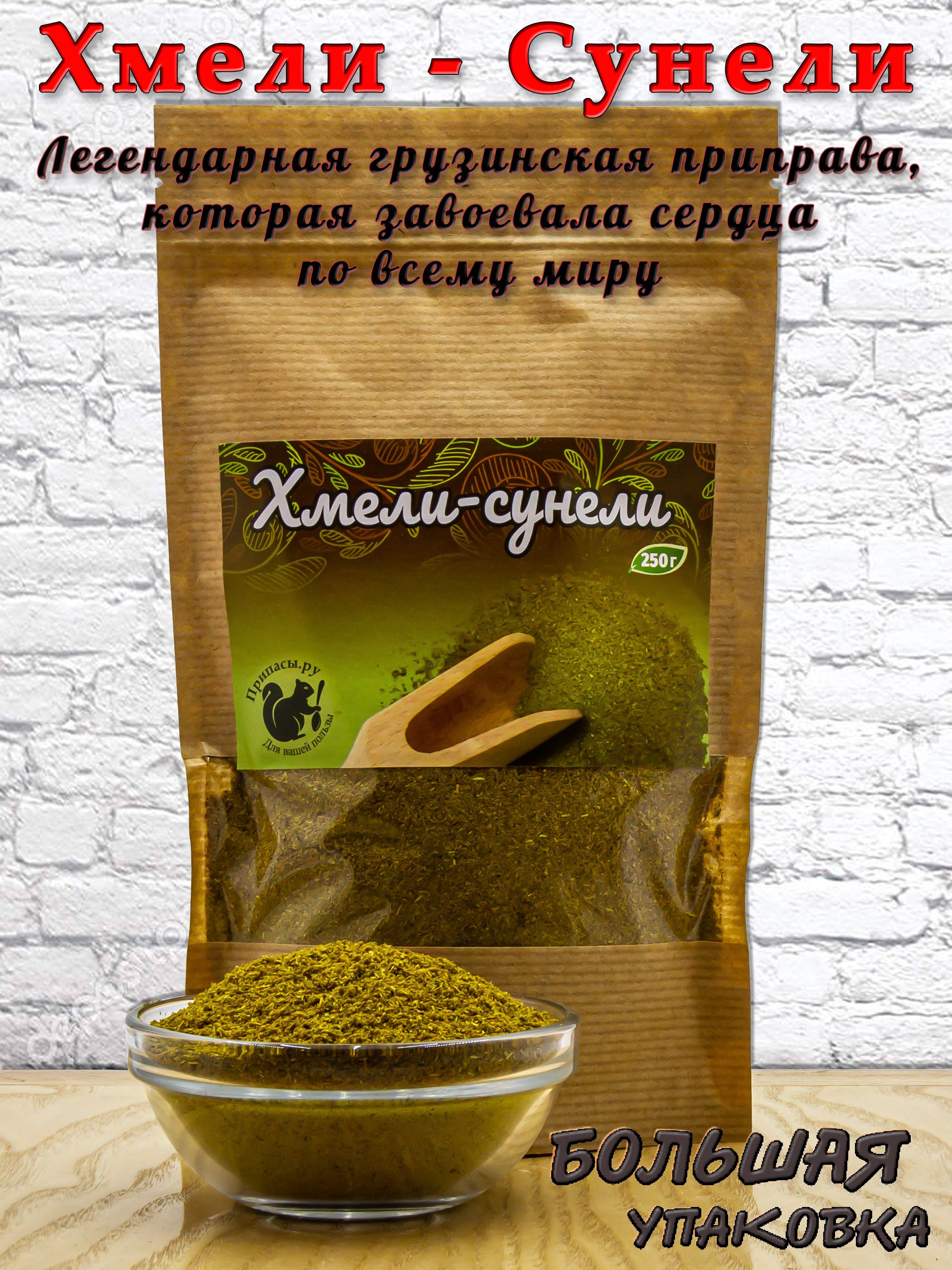Описание: Хмели-сунели - перевод с грузинского слов сухая приправа. Это смесь разных трав и специй, образующих ароматный порошок, который хорош для разных видов блюд. Все они были высушены и измельчены. Хмели-сунели - традиционная грузинская пряная смесь. Применяется в грузинских национальных блюдах и соусах: сациви, харчо, лобиани, тушеной говядина по-грузински, ткемали, аджике и др. Считается идеальной приправой для блюд из мяса, птицы, а также мясных супов и бульонов. Ее также приправляют рыбу - рыбные блюда с добавление этой приправы приобретают очень ароматный вкус. Хмели-Сунели добавляют также в мясные, рыбные, овощные маринады. Является основной знаменитой кавказской приправы - аджики. Не содержит соли
