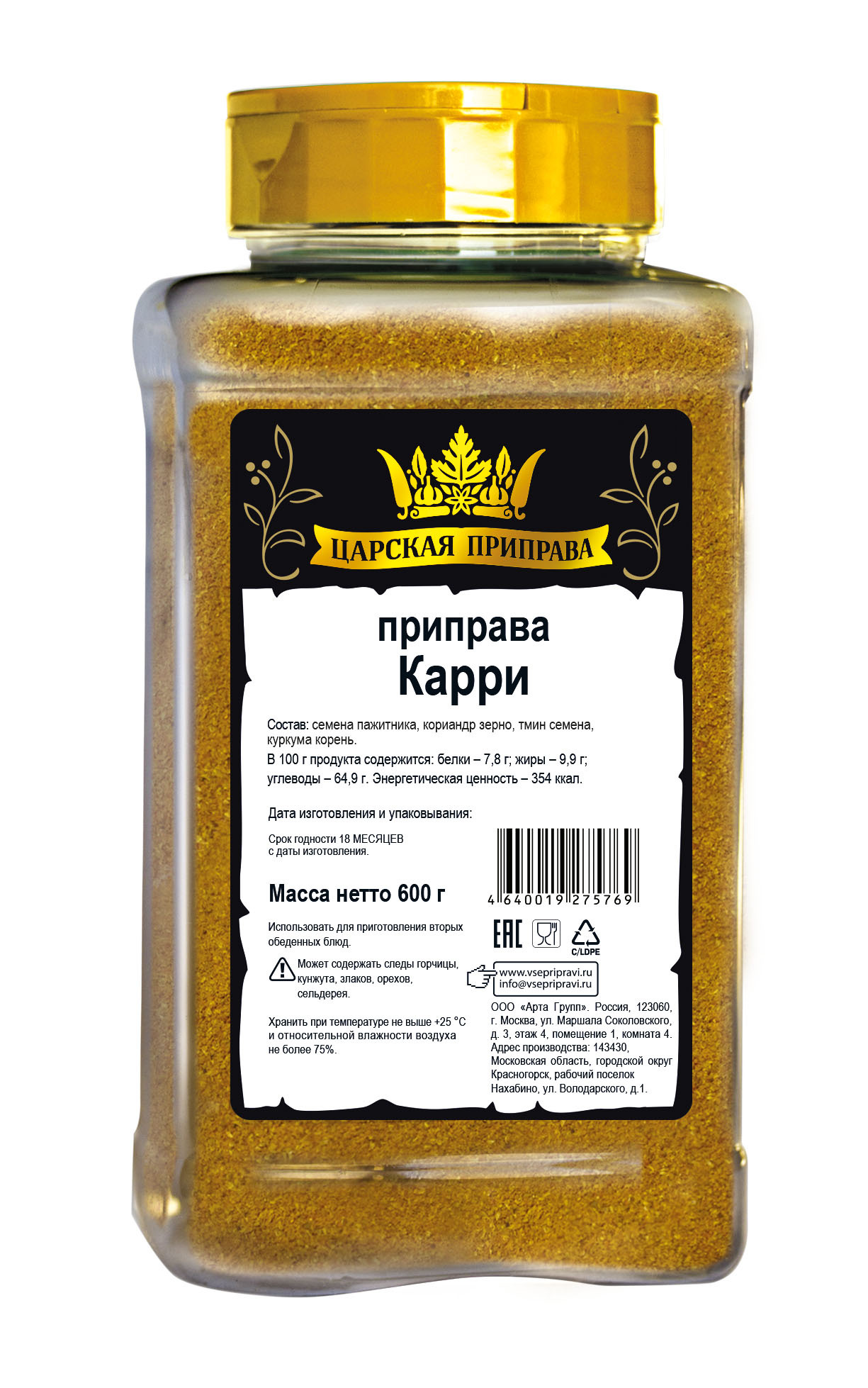 Приправа карри молотая "Царская приправа" ПЭТ с дозатором, 600 г