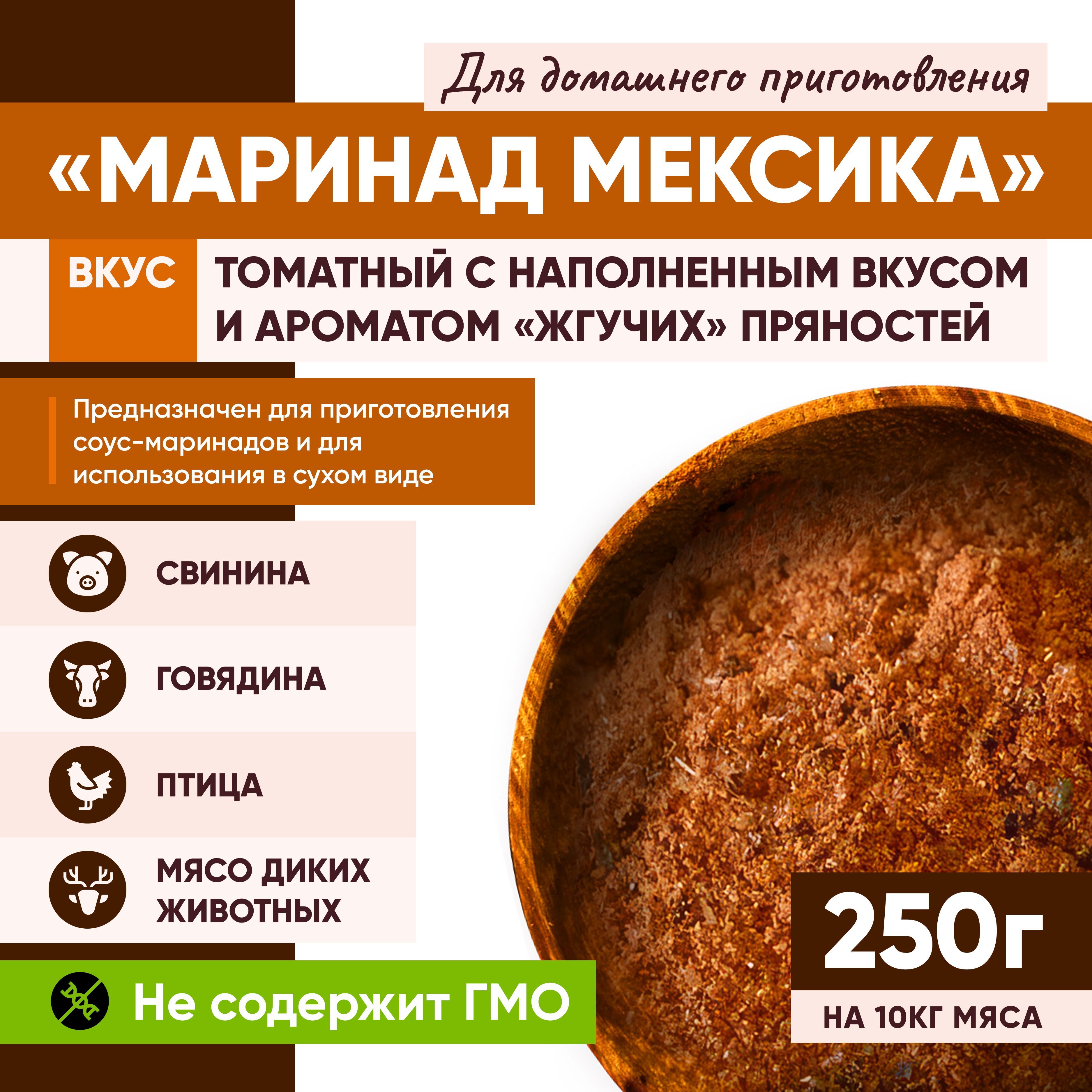 Описание: Маринад "Мексика" специи для свинины, говядины, птицы и диких животных. Вкус томатный с наполненным вкусом и ароматом «жгучих» пряностей Способы использования: 1. Использование предварительно подготовленного соус-маринада. Рекомендуемые соотношения компонентов: - для соленого мясного сырья: (1:3:1) смесь/вода/масло или (1:4) смесь/вода - для несоленого мясного сырья: (1:3:1:0,5) смесь/вода/масло/соль или (1:4:0,5) смесь/вода/соль В холодную воду, помешивая, засыпают сухую смесь. Продолжают перемешивать до полного растворения компонентов смеси в воде (обычно 0,5-1,0 минут). В полученную густую массу вливают растительное масло, и перемешивают еще 0,5-1,0 минут до получения однородной массы 2. Использование маринада в сухом виде. При добавлении маринадов в сухом виде, рекомендуется вносить его на мясное сырье из расчёта 100 грамм маринада на 4кг мяса. Приятного аппетита!