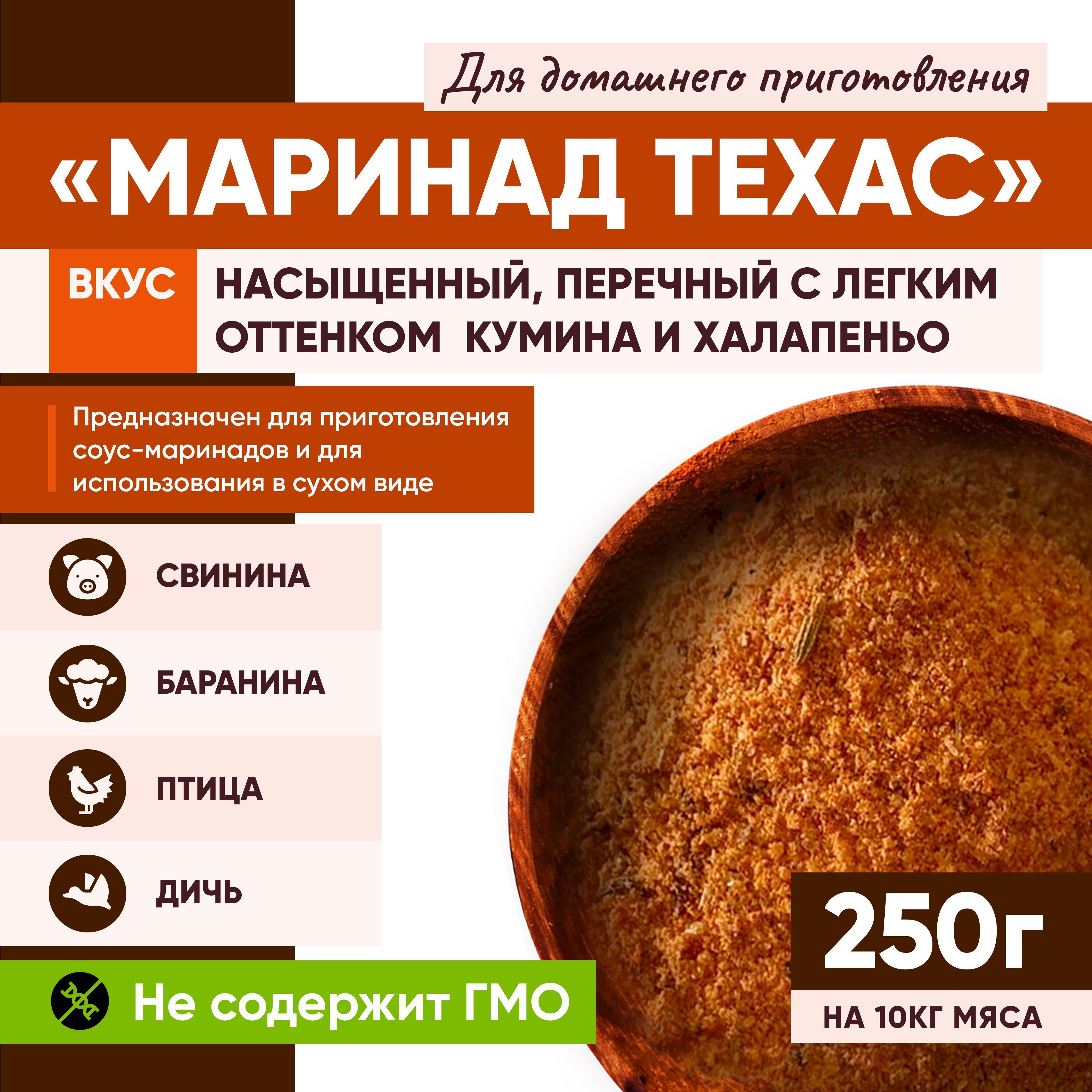 Описание: Маринад "Техас" специи для свинины, баранины, курицы и дичи, шашлыка. Вкус насыщенный, перечный с легким оттенком кумина и халапеньо. Способы использования:1. Использование предварительно подготовленного соус-маринада.Рекомендуемые соотношения компонентов:- для соленого мясного сырья: (1:3:1) смесь/вода/масло или (1:4) смесь/вода- для несоленого мясного сырья: (1:3:1:0,5) смесь/вода/масло/соль или (1:4:0,5) смесь/вода/сольВ холодную воду, помешивая, засыпают сухую смесь. Продолжают перемешивать до полного растворения компонентов смеси в воде (обычно 0,5-1,0 минут). В полученную густую массу вливают растительное масло, и перемешивают еще 0,5-1,0 минут до получения однородной массы.2. Использование маринада в сухом виде.При добавлении маринадов в сухом виде, рекомендуется вносить его на мясное сырье из расчёта 100 грамм маринада на 4кг мяса. Приятного аппетита!