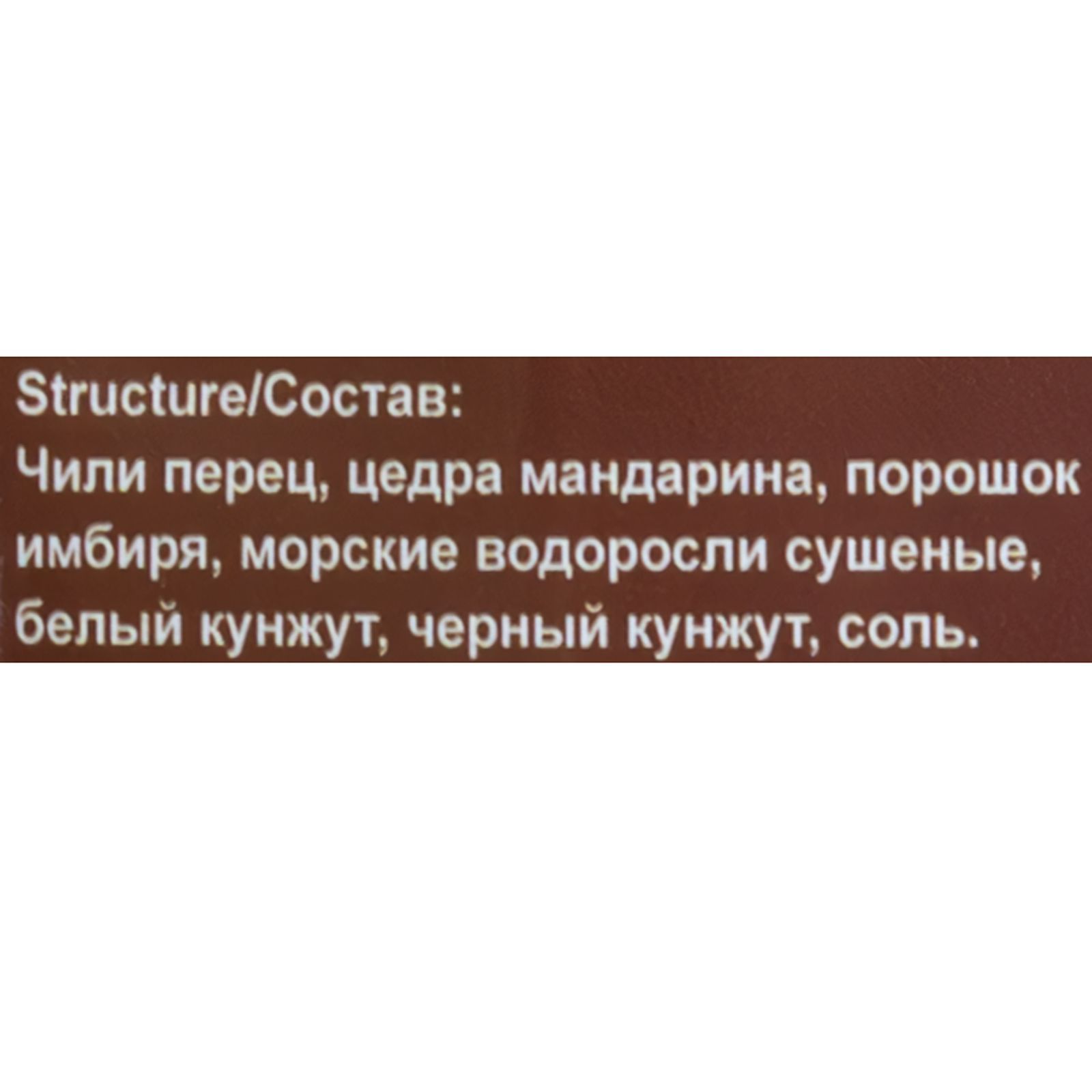 Чили перец, цедра мандарина, порошок имбиря, морские водоросли сушеные, белый кунжут, черный кунжут, соль.