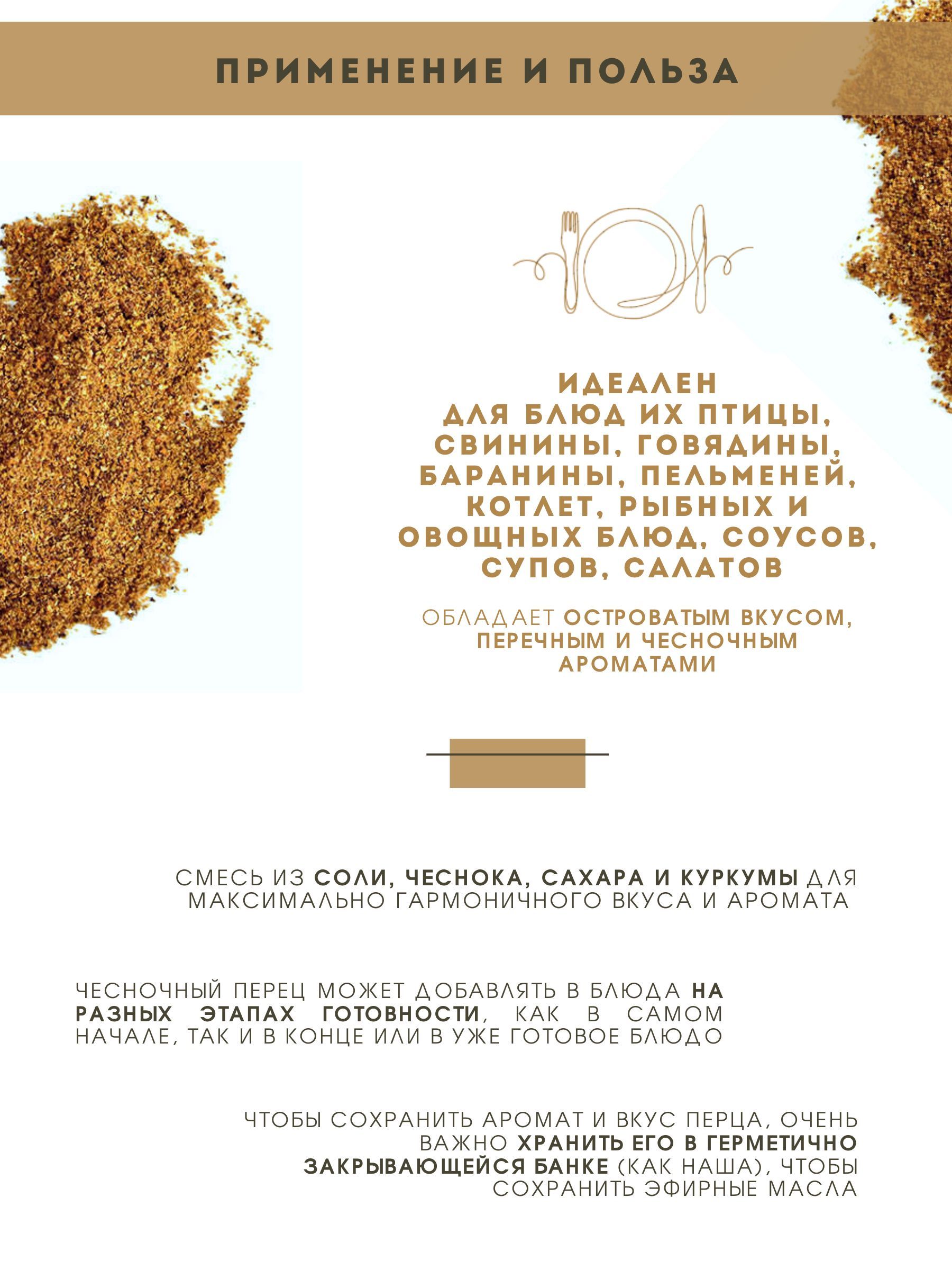 Описание: Чесночный перец - ароматная приправа из сушеного чеснока, куркумы, сахара соли. Чесночный перец популярен в русской, итальянской, французской кухнях. Приправа перец чесночный обладает приятным островатым вкусом, перечным и чесночным ароматами. Смесь специй усиливает аппетит, стимулирует пищеварение, оказывает антисептическое действие. Чесночный перец идеален для блюд из птицы, баранины, говядины, свинины. Его добавляют как в полуфабрикаты, так и в свежеприготовленные блюда перед подачей. Приправа также подходит для пельменей, котлет, блюд из рыбы, овощных блюд, для соусов, супов, салатов. Чесночный перец богат витаминами, микроэлементами и другими полезными веществами. Приправа обладает антисептическими и антиоксидантными свойствами. Перец молотый чесночный возбуждает аппетит, помогает укрепить иммунитет, стимулирует метаболизм, повышает давление. Хорошо сочетается с другими видами перца (перец черный горошек, смесь перцев, лимонный перец), а так же с такими специями как имбирь, паприка, чеснок, смесь специй приправа для плова, для шашлыка, 12 овощей и трав.