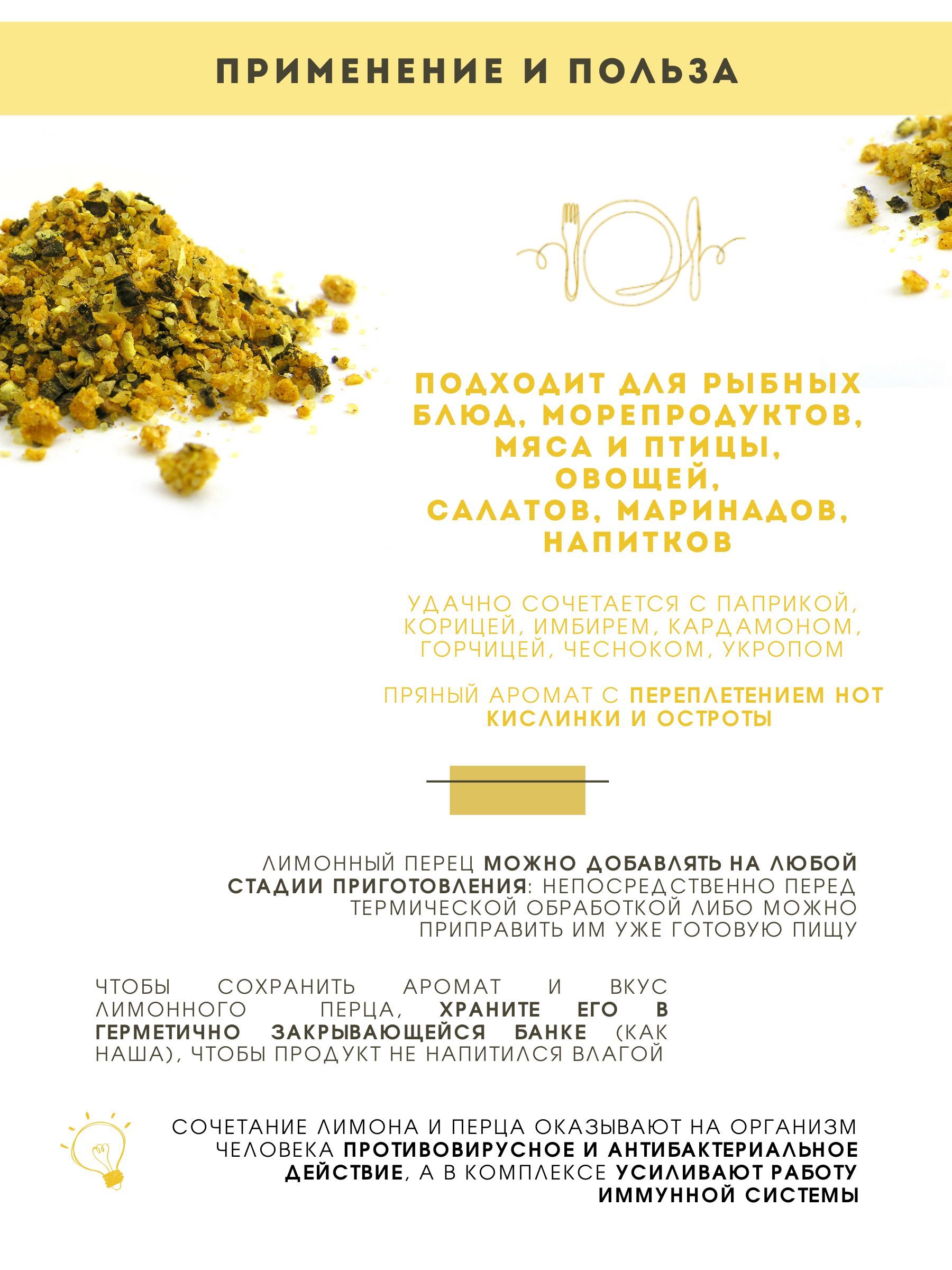Описание: Лимонный перец ТМ Ферма - ваш незаменимый помощник на кухне для поваров и любителей готовить. Перец молотый лимонный — приправа из черного перца с добавлением лимонной цедры и лимонной кислоты. Лимонный перец пряно-кислый на вкус, с легким послевкусием черного перца. Специя сочетается с паприкой, имбирем, кардамоном, горчицей, чесноком, укропом. Смесь специй лимонный перец добавляют во время перемешивания основных ингредиентов блюда, перед началом тепловой обработки или по ее завершению, в зависимости от требований рецепта. Приправа лимонный перец идеально подходит для рыбы, морепродуктов, для курицы, птицы и дичи, для шашлыка, овощей и салатов. А так же маринования, засолки, соусов, выпечки и кулинарных изделий. Используется при изготовлении алкогольных напитков собственного производства, первых и вторых блюд. Лимонный перец молотый богат витаминами и микроэлементами, полезными для организма человека. Продукт помогает укрепить иммунитет, активизирует обмен веществ, возбуждает аппетит, повышает артериальное давление, обладает антисептическими свойствами. Приправа содержит антиоксиданты, которые защищают клетки от старения. Лимонный перец ТМ Ферма не содержит сахар и соль, усилители вкуса и глутамат, а значит будет максимально полезной для вашего здоровья!