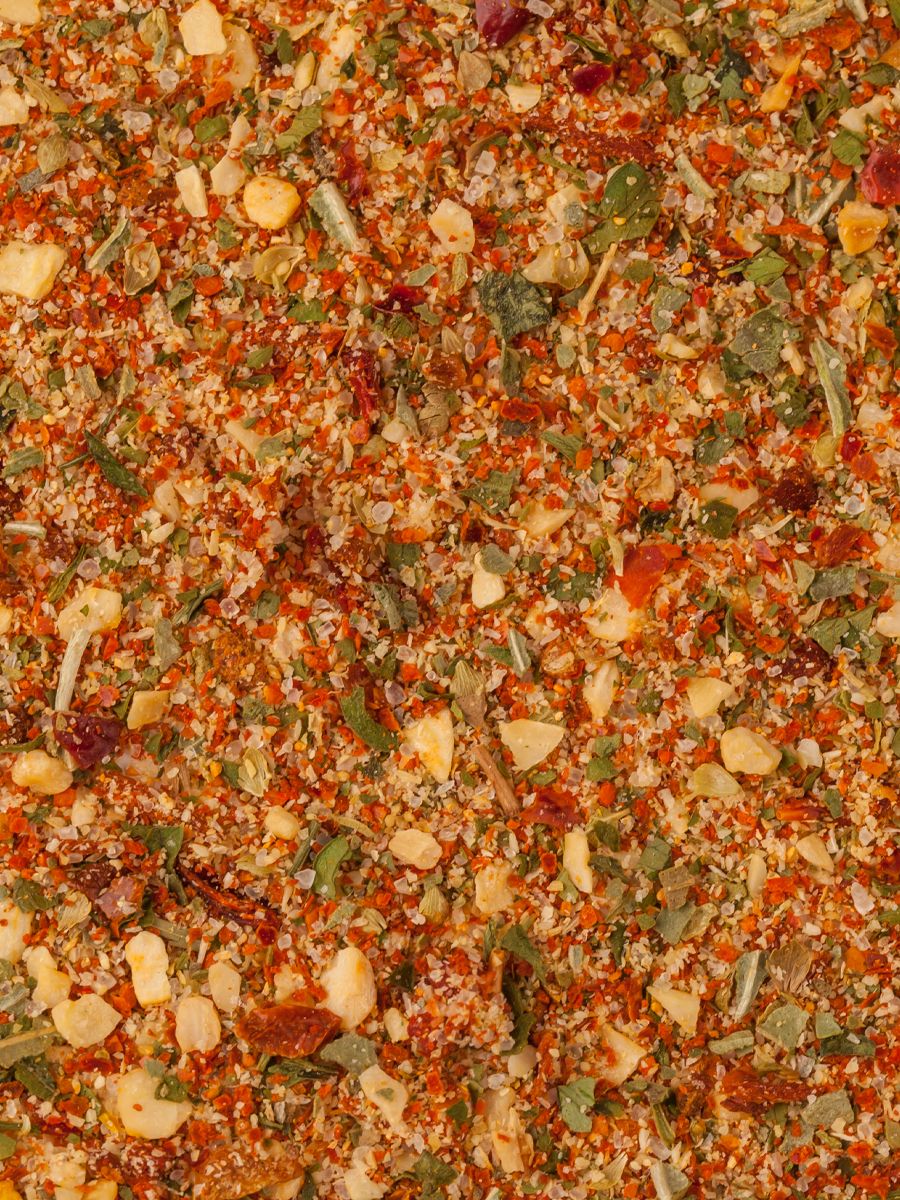 лук, соль морская йодированная (соль морская, калия йодат), чили, чеснок, томаты гранулированные, паприка, петрушка, хлопья томатов (томаты, кукурузный крахмал), орегано, базилик.