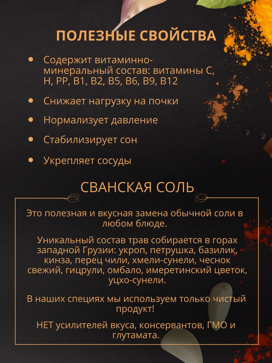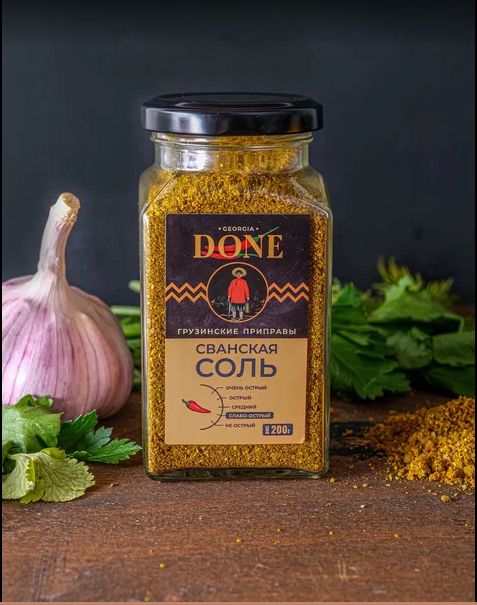 Описание: Сванская соль классическая - это популярная грузинская приправа смесь соли со специями и травам, которую отличает приятный островатый вкус и пряный аромат. Грузинский высокогорный район Свенетия - место, где впервые стали использовать эту соль для приготовления национальных блюд. Эта традиционная универсальная приправа вкусная ароматная соль идеально подойдет для салатов супов  мяса курицы и рыбы , соусов и маринада , с ней получится самый ароматный омлет и несладкая выпечка. Сванская соль Грузия считается полезной для здоровья. Свежие и высококачественные специи, входящие в состав приправы, помогают нормализовать сон, укрепить сосуды, нормализовать давление, а также снижают нагрузку на почки, благодаря мочегонному эффекту. Соберите свой набор специй с пряностями и приправами DONE , откройте для себя все вкусы мира . Приправы в банках незаменимые помощники хозяйки или хозяина на кухне, а качество и аромат свежесмолотых специй ДОНЕ по праву ценят шеф-повара лучших ресторанов Москвы. Мы будем рады вашим отзывам, фотографиям блюд и будем особенно благодарны, если вы добавите наш бренд в избранное, потому что нам есть чем вас удивить! Выбирайте лучшие грузинские специи!Состав:соль морская чеснок перец чили базилик сушеный укроп петрушка имеретинский цветок уцхо-сунели хмели-сунели кинза гицрули омбало
