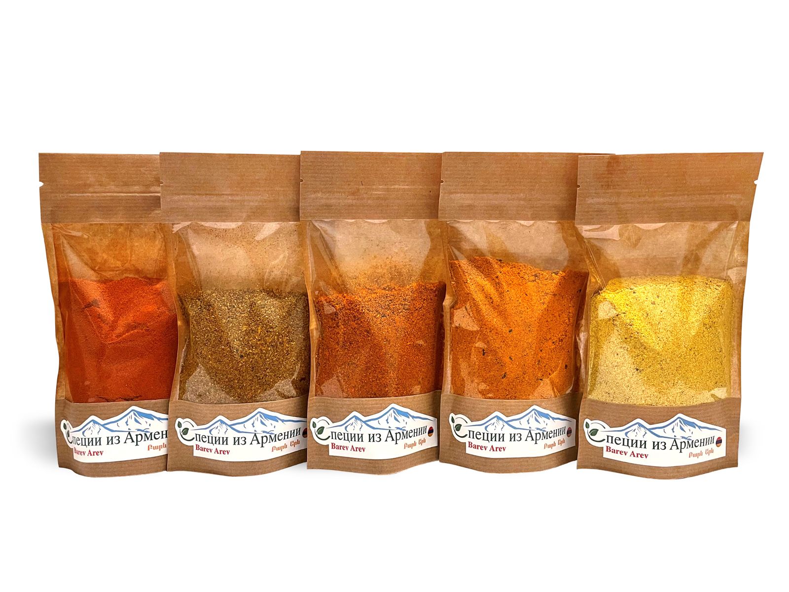 Укроп, тмин, соль, красный перец, уцхо-сунели, кориандр, чеснок, имеретинский шафран