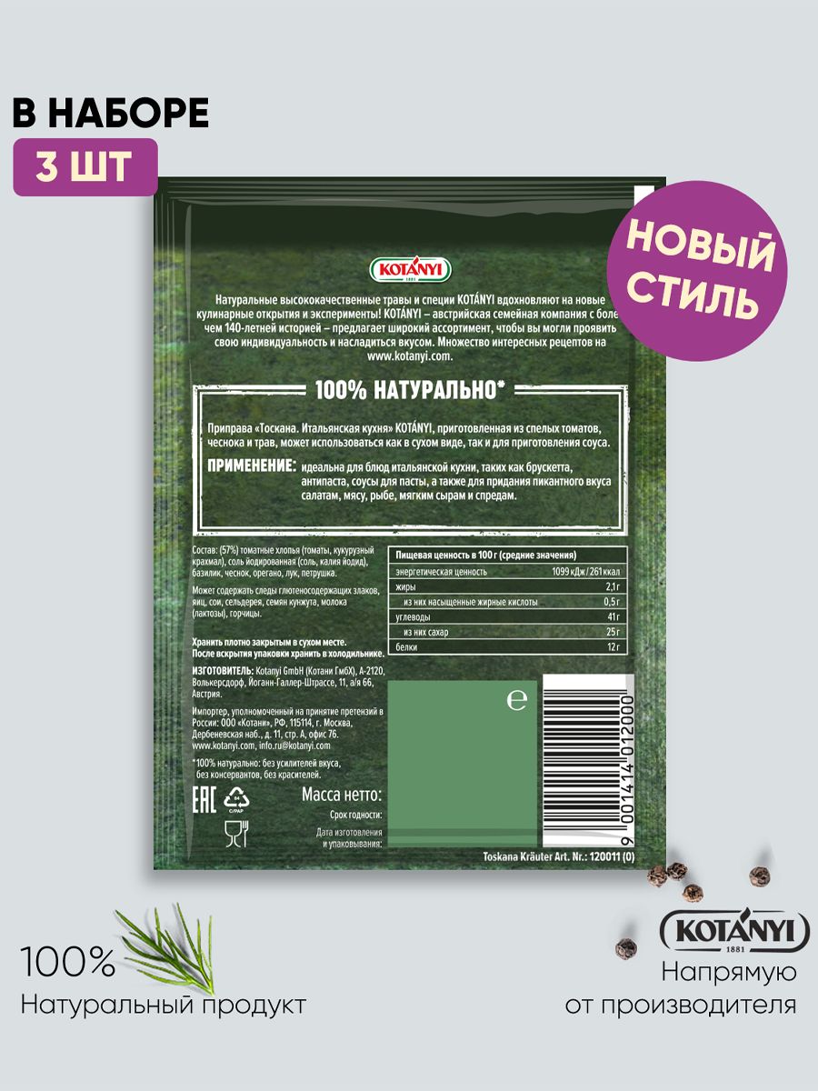 Приправа Тоскана. Итальянская кухня KOTANYI, 20 г - 3 пакетика