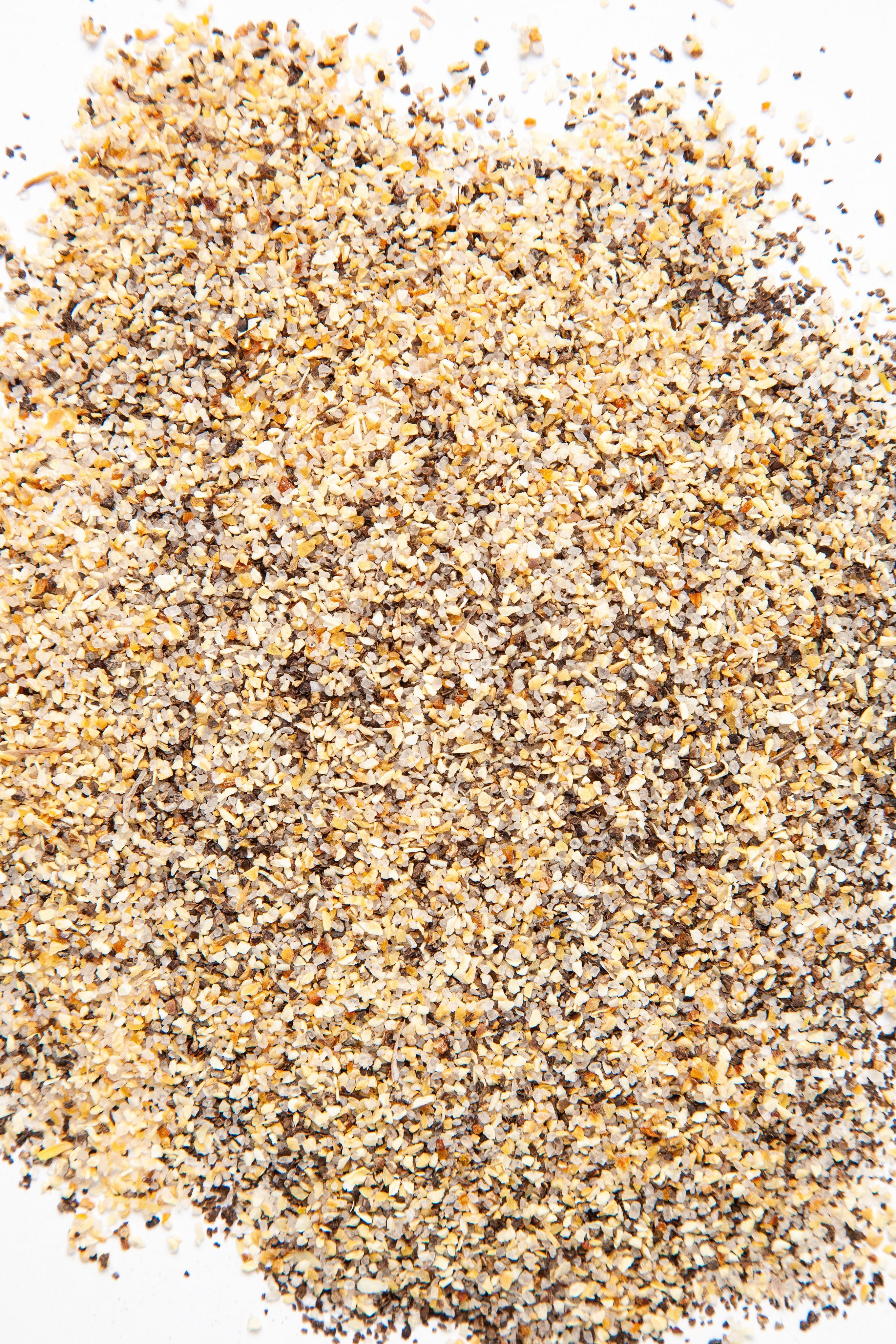 морская соль, сушёный чеснок, чёрный перец молотый крупного помола.