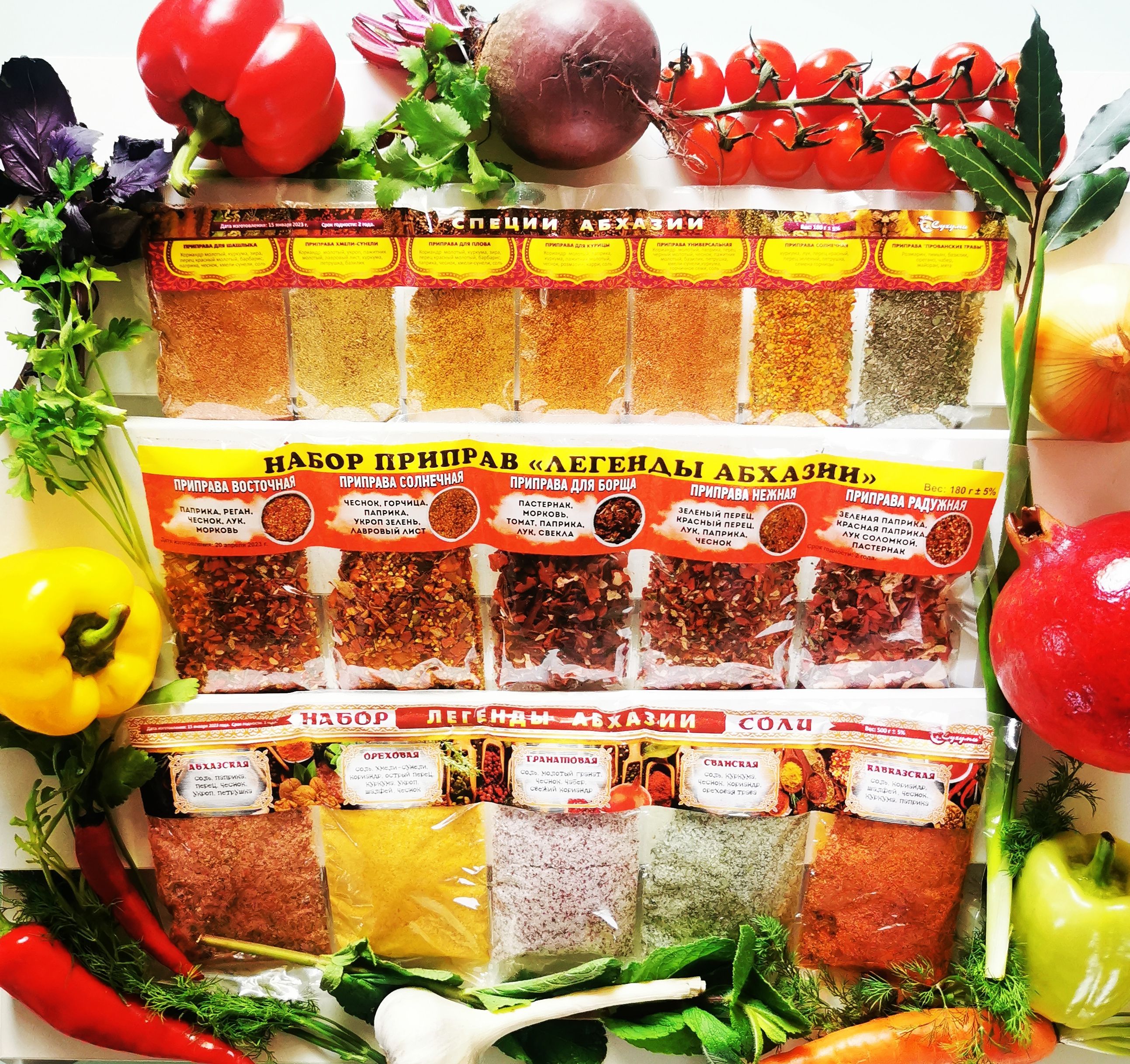 Специи Абхазии (для шашлыка, хмели-сунели, для плова, для курицы, универсальная, солнечная, прованские травы) вес 185 гр., Набор приправ "Легенды Абхазии" (приправа: восточная, солнечная, для борща, нежная, радужная) вес 180гр.,Набор Легенды Абхазии соли (абхазская, ореховая, гранатовая, сванская, кавказская) вес 500гр.