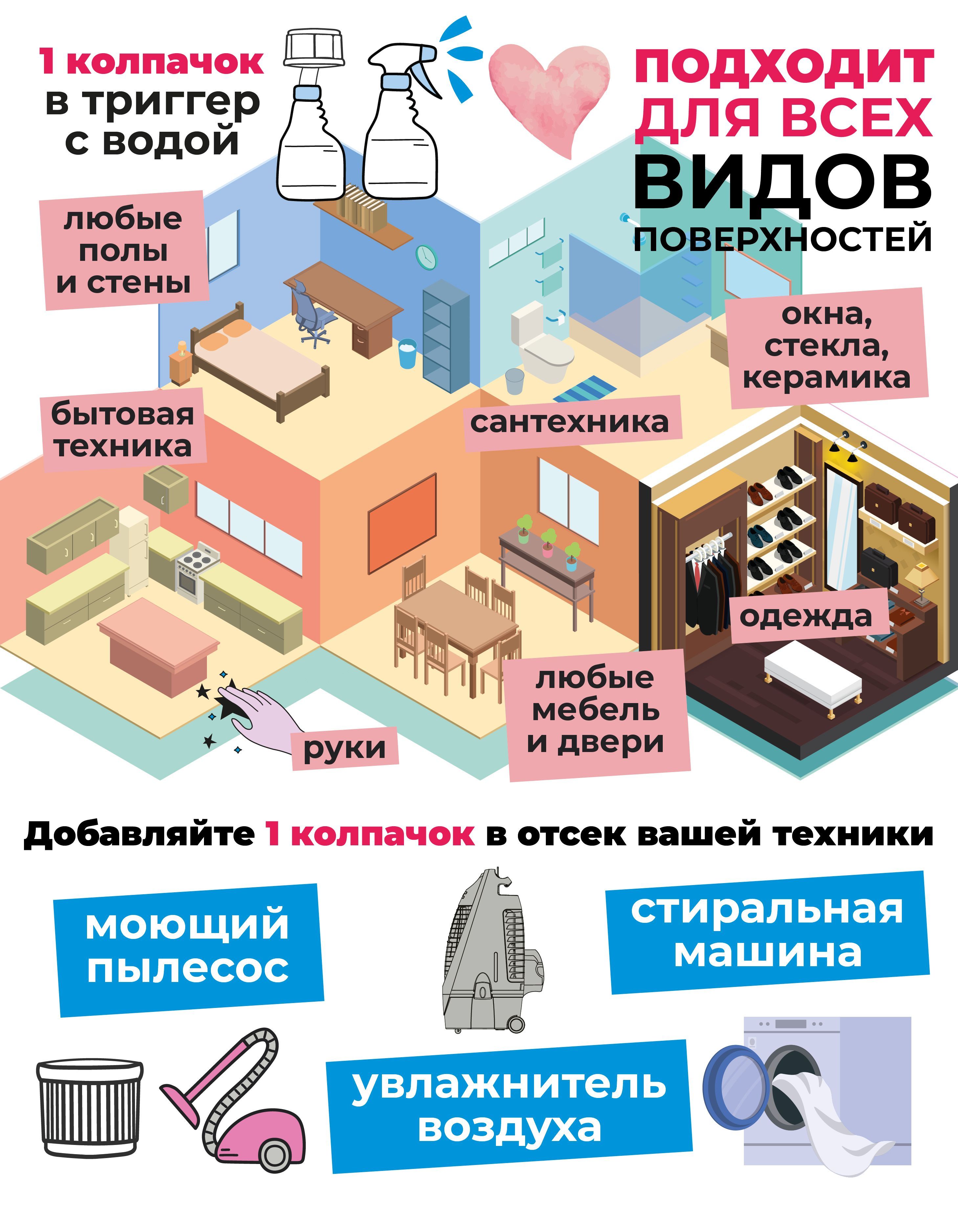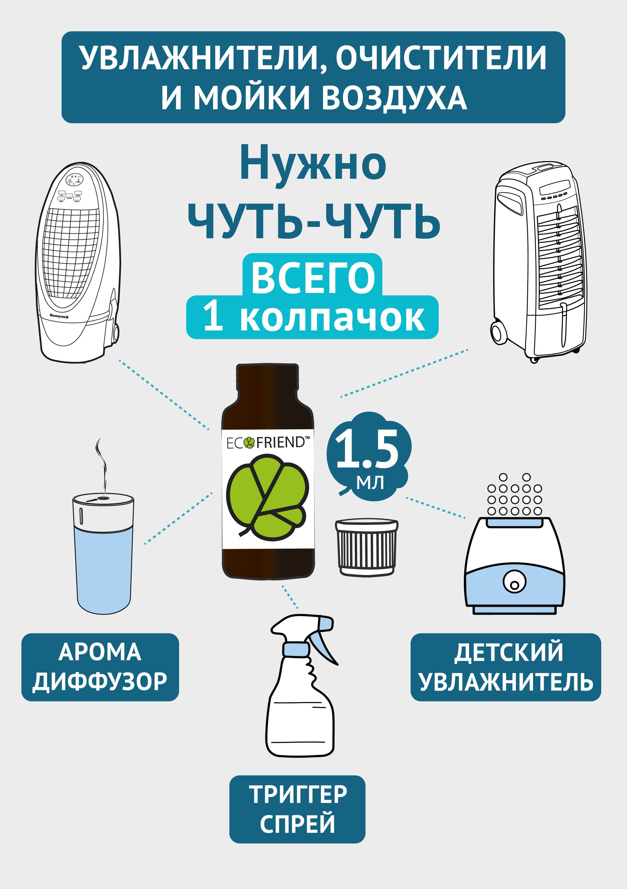 Область применения: Всего одна крышечка ( колпачок) на бак увлажнителя или мойки воздуха , а в распылители на каждые 500-700 мл два колпачка концентрата. Применять как обычно - распыляя в пространстве или стандартная работа приборов по увлажнению.
