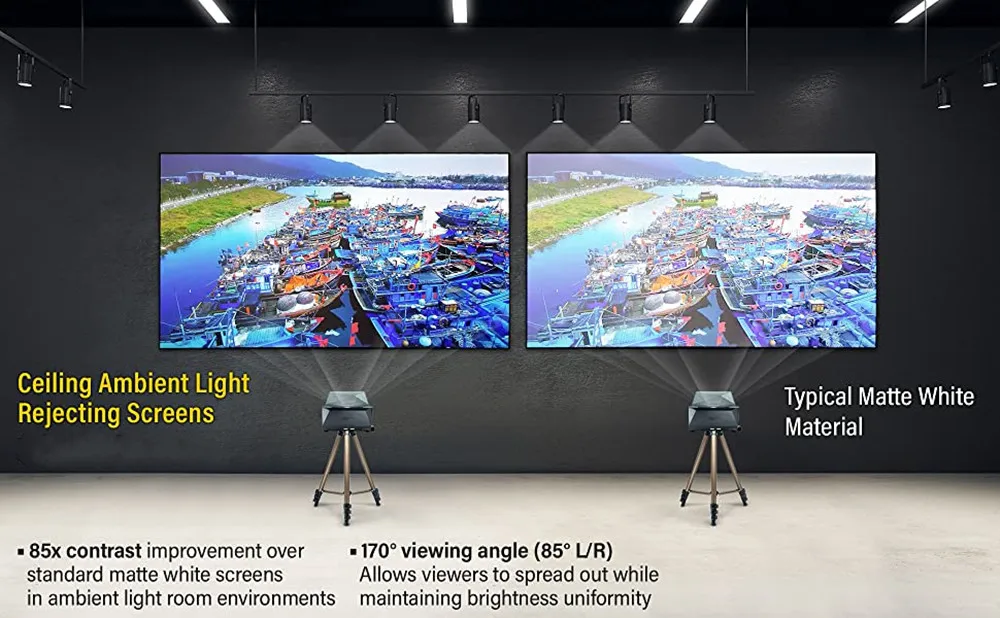 This screen is specifically designed for ultra-short-throw projectors to provide a large-screen performance in the close quarters of most residential or even training environments. Its serriform optical surface lens microstructure negates the washout effect of ambient light especially from overhead sources. This also enables the material to provide contrast levels that are 100 times greater than that of standard matte white projection screens.