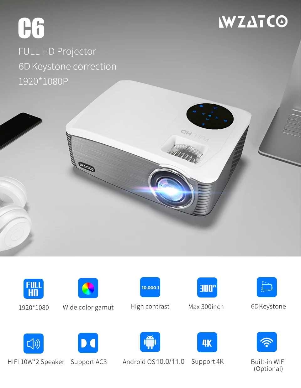WZATCO C6 300 дюймов Full HD 1920*1080P светодиодный проектор Android 10.0 WIFI Smart Video Proyector домашний кинотеатр плеер игра Beamer