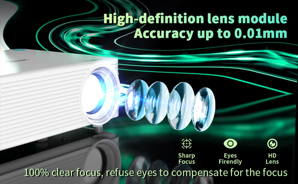 【Четкие изображения и дружественные к глазам: линзы, сравнимые с верхними камерами 】этот Проектор использует эксклюзивную инновационную оптическую систему и высококачественные оптические линзы, произведенные японской компанией. Объектив использует несколько стеклянных линз с высоким коэффициентом преломления. Фокусировка объектива является точной, а края и центр изображения на 100% резко сфокусированы, что не позволяет глаз компенсировать фокус. Поэтому проектор дружелюбен к глазам, и глаза не будут уставать после длительного использования.