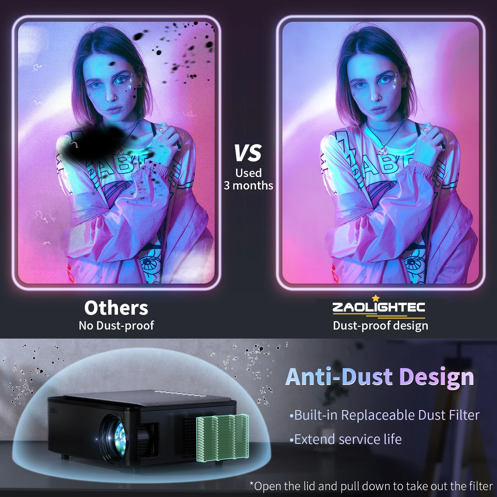 • 🎵【Многоинтерфейс, Wi-Fi, Пылезащитный фильтр и сенсорная кнопка】 2 аудиопорта HDMI/2 USB/3,5 мм. Удобное подключение TV Stick / Laptop/ DVD-плеера/PS4 / TV Box. Функция синхронизации беспроводного Wi-Fi и проводного экрана. Пылевой фильтр сбоку проектора может предотвратить попадание внешней пыли в проектор. Не беспокойтесь о потере пульта дистанционного управления с добавлением сенсорных кнопок!