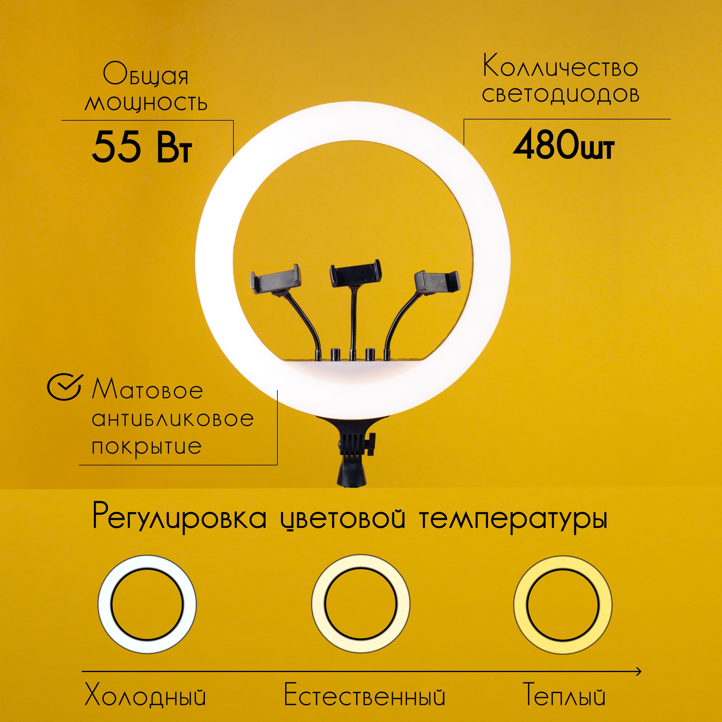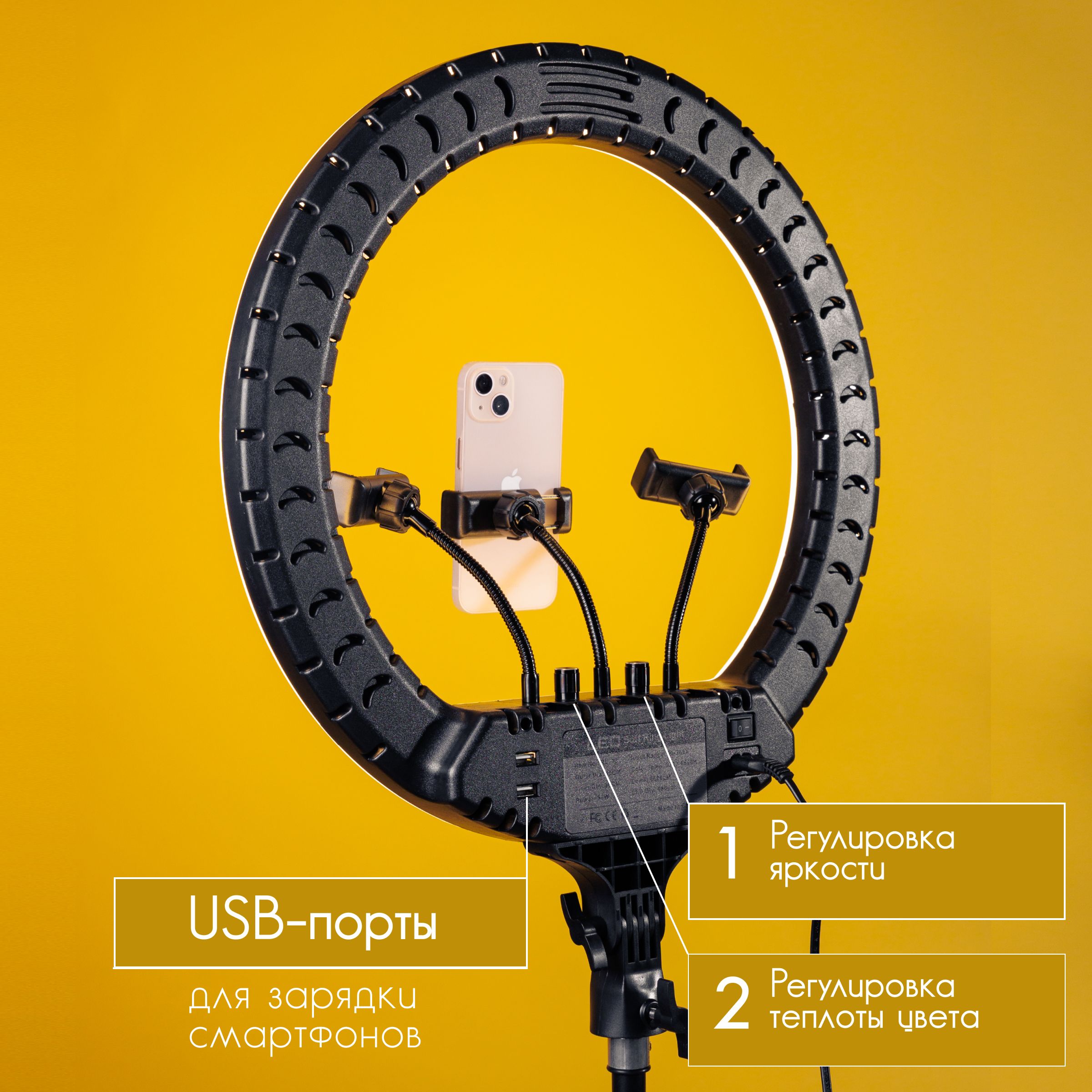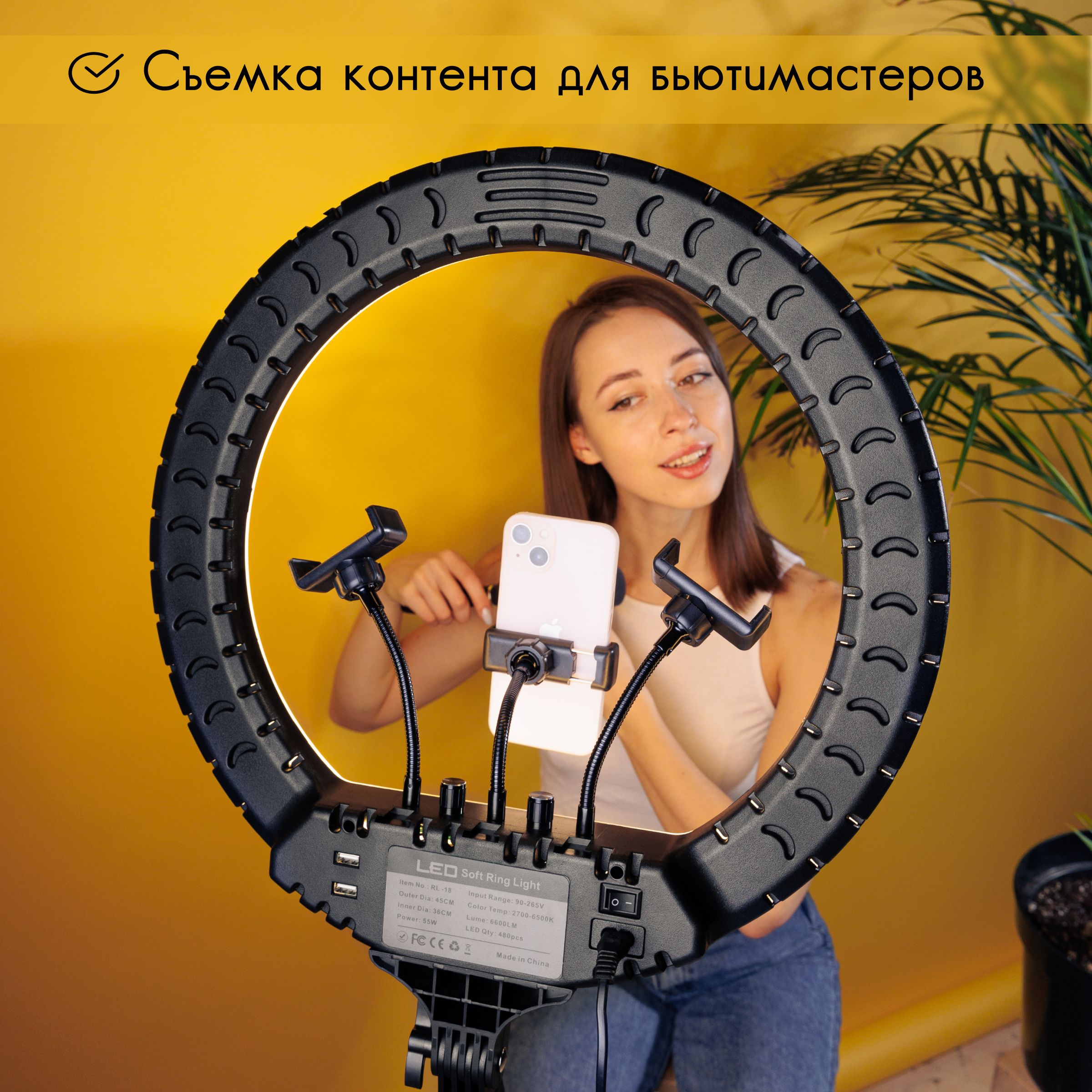Кольцевая лампа 45 см - 1 шт Штатив Усиленный - 1 шт Сумка для переноски - 1 шт Крепления для телефона - 3 шт Пульт - 1 шт