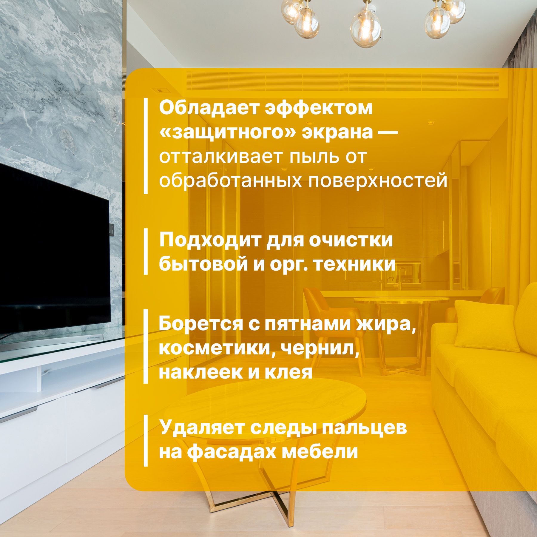 Эффективно удаляет пыль с вертикальных поверхностей, а также следы жира, масла, косметики, чернил и пасты, клейкой ленты и клея.
