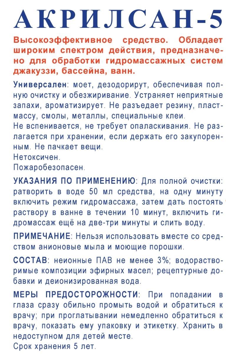 Описание: Препарат для очистки системы джакузи АКРИЛСАН-5 (Akrilsan 5) это товар Российского производства. И намного эффективнее своих аналогов которые хоть и стоят дешевле но не обладает той концентрации и расход соответственно в три раза больше в итоге купив одну бутылку нашего чистящего средства для джакузи вы сменили бы уже 3-4 бутылки аналогичного малоэффективного препарата. Расход всего 50 мл. на 100 л. воды